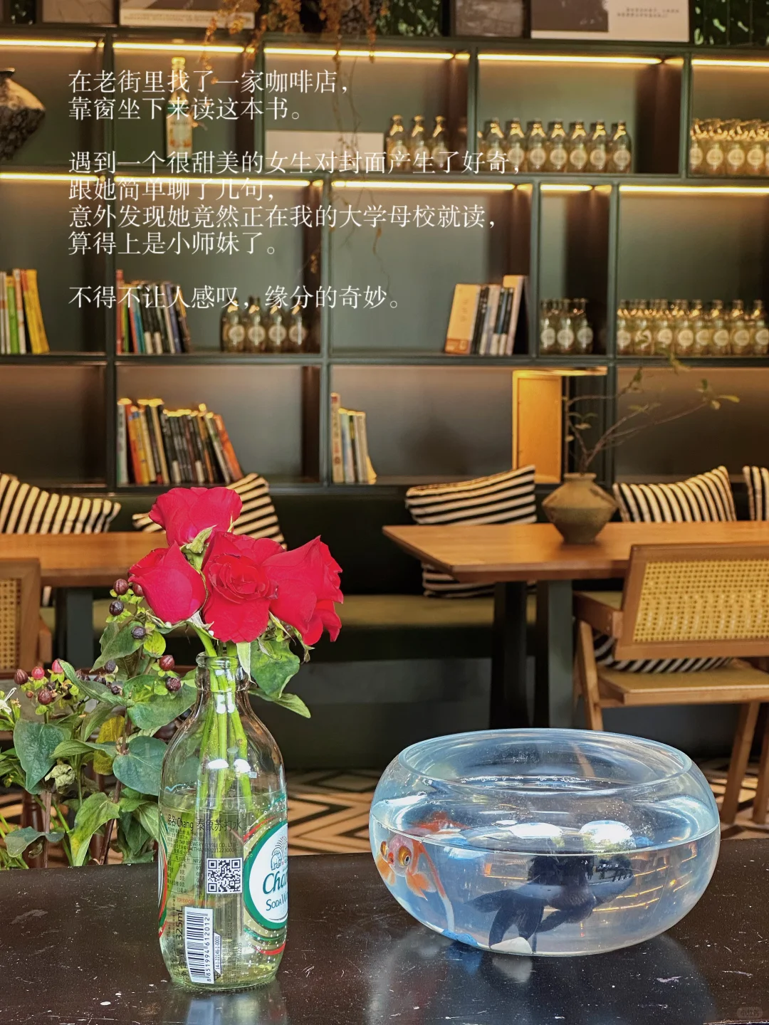 在老街里找了一家咖啡店,靠窗坐下来读这本书。遇到一个很甜美的女生对封面产生了好奇,跟她简单聊了几句,意外发现她竟然正在我的大学母校就读,算得上是小师妹了。不得不让人感叹,缘分的奇妙。