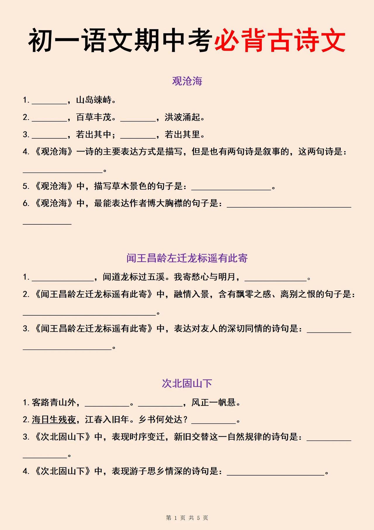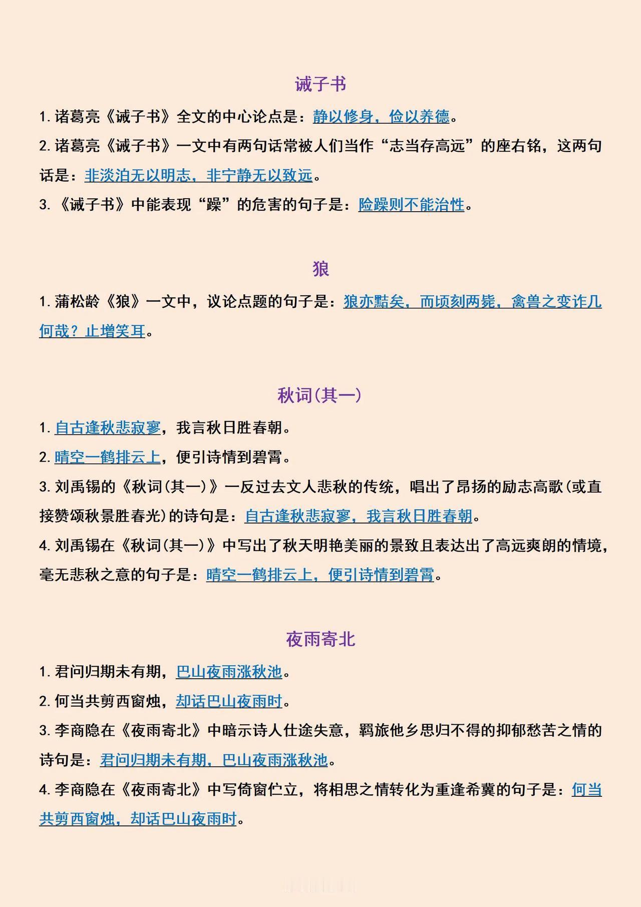 初一,七年级语文期中考试必背古诗文名句