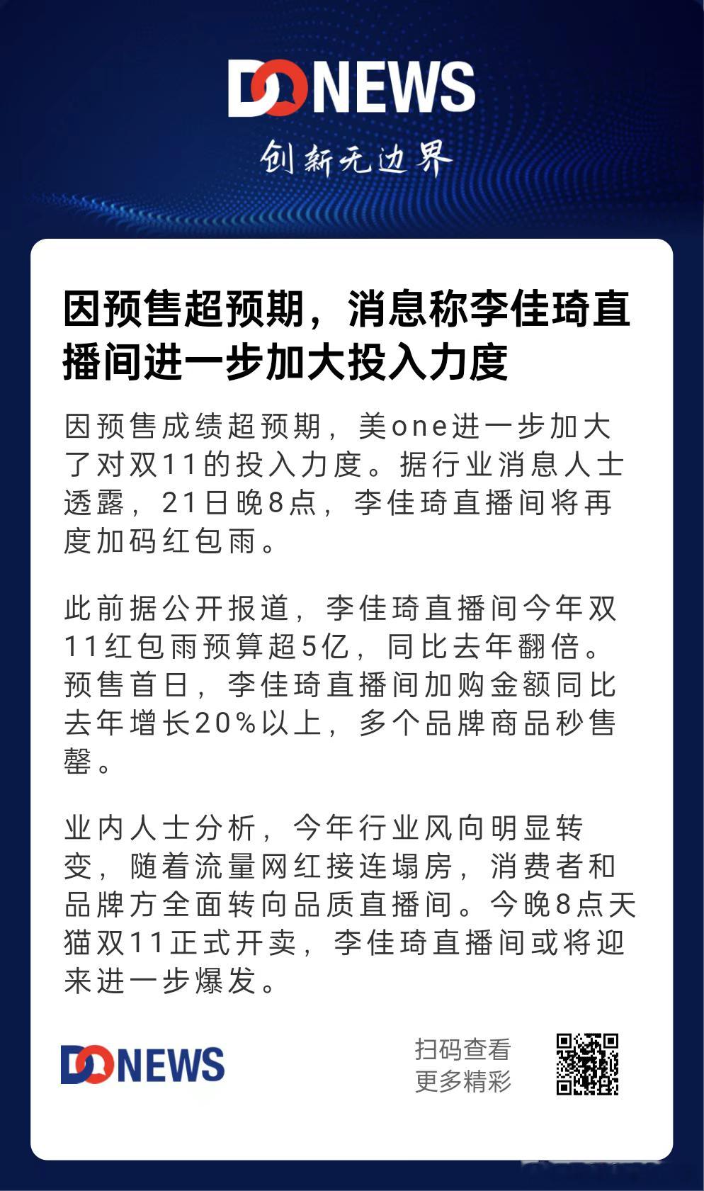 今年双十一应该是史上压力最大的双十一了,我们小卖家还好,集中在头部主播间的竞争绝对是白热化的,而且今年情况比较特殊,好几个大主播都趴下了,那么像李佳琦这种元老级的头部主播就要更用力来承接这波购买力。