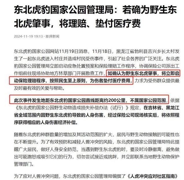 其中两句话在网上引发了大量讨论,大概意思是:如果确认是野生东北虎干的,将立即启动理赔程序,并垫付医疗费用;而此次事件发生地距东北虎豹国家公园直线距离约200公里,不属国家公园范围。