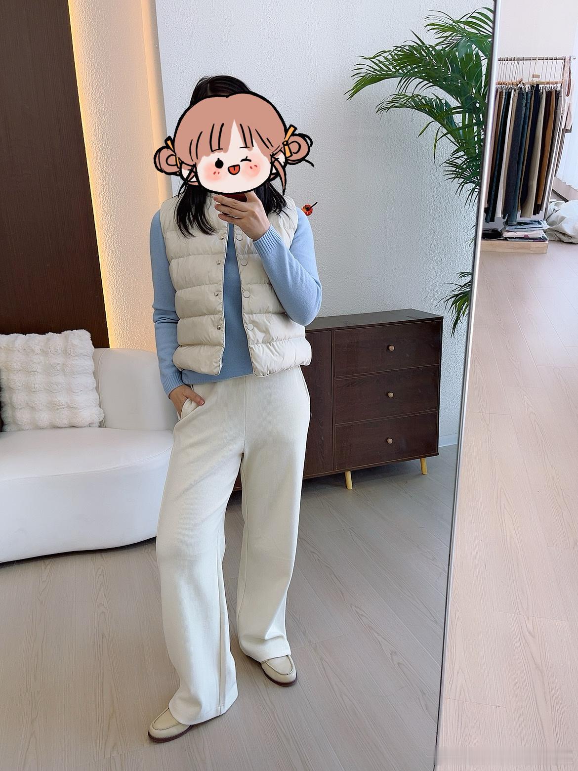 这条裤子,这次模特照片没拍好,实物真的非常惊艳,一共四个颜色,我第一次试的灰色,这次又试了白色和黑色,我强烈推荐你们入白色和黑色两个色,白色非常百搭洋气,黑色非常显瘦,版型不是大阔腿,是比较端庄收敛的阔腿,配毛衣配T都可以,外套配冲锋衣(就是我自己那件天花板冲锋衣,嘿嘿嘿,好看吧[嘻嘻])和羽绒服也都可以,可休闲可商务,巨好看!