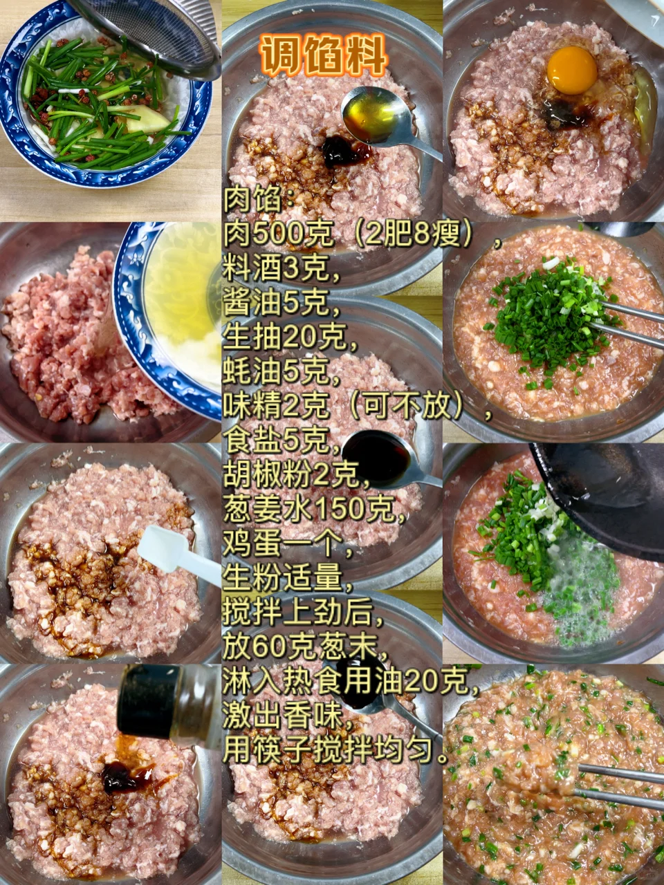 肉500克(2肥8瘦),料酒3克,酱油5克,生抽20克,蚝油5克,味精2克(可不放),食盐5克,胡椒粉2克,葱姜水150克,鸡蛋一个,生粉适量搅拌上劲后,放60克葱末,淋入热食用油20克,激出香味,用筷子搅拌均匀。