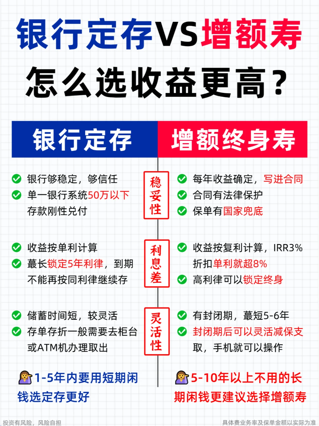 👉如果5-10年以上不用的长期闲钱,更适合放在增额终身寿里,利律锁定终身,收益更高