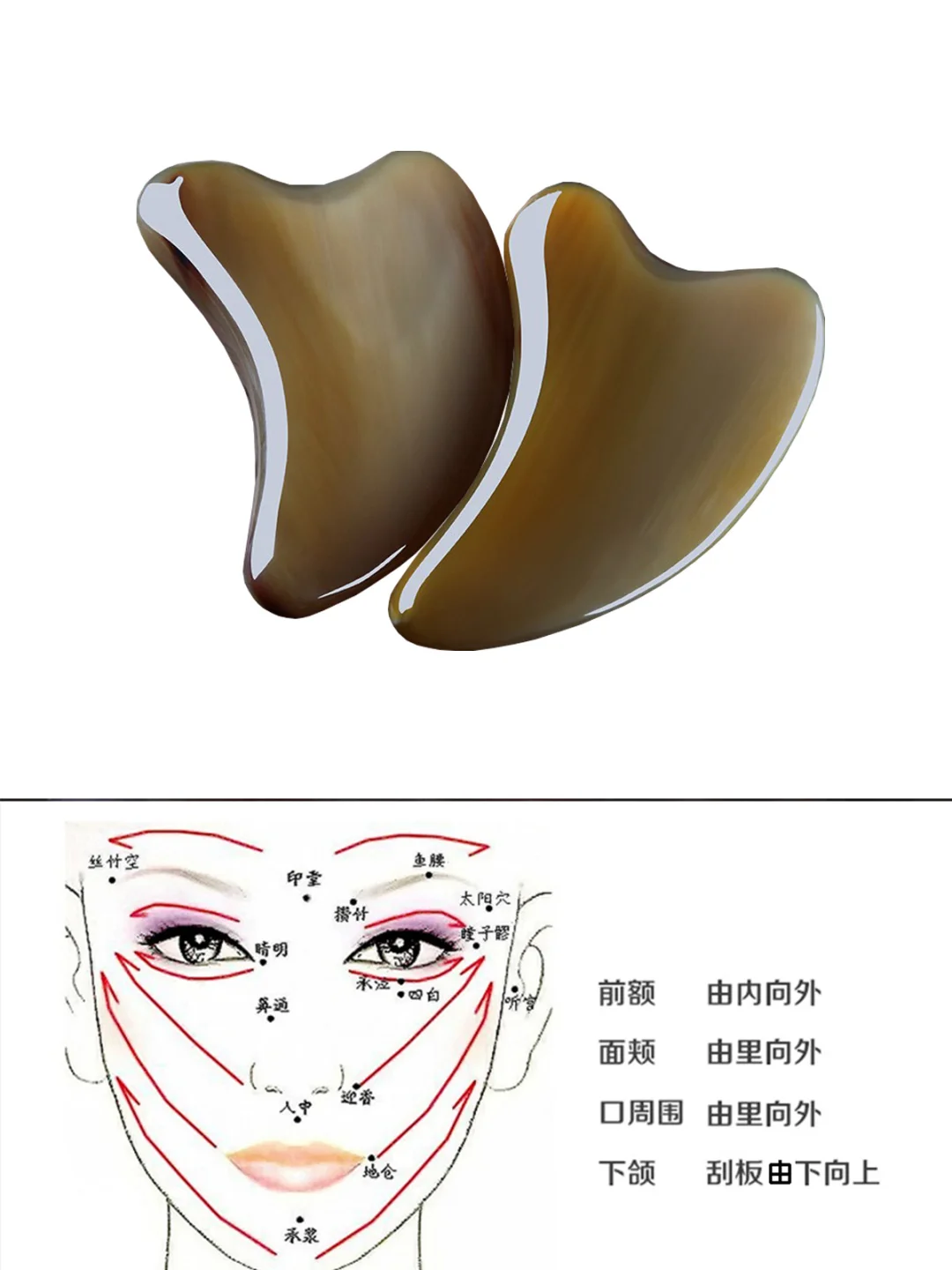 平日面部表情丰富的女生,从下往上刮拭,提升前额的纹路。