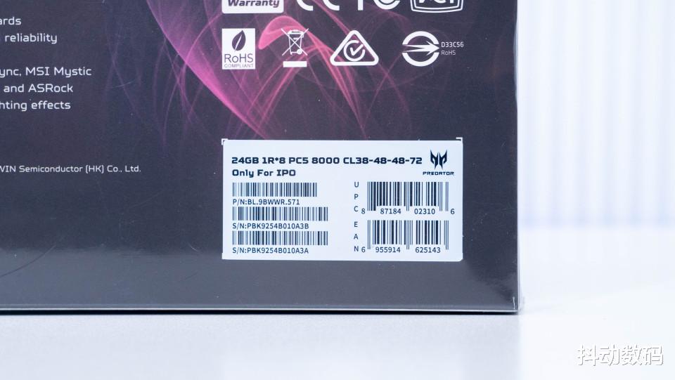 宏碁掠夺者Hermes冰刃8000MHz 24GB x2内存,这套内存还是为intel IPO专属设计的,在包装正面与背面都有细节标注。