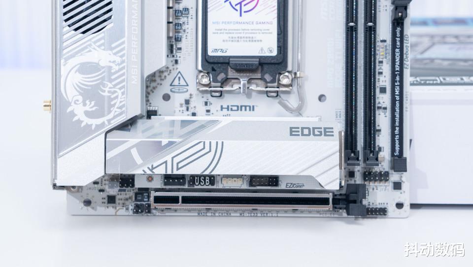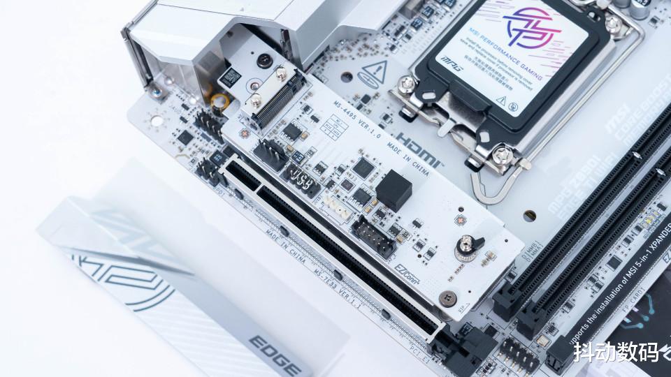 另外为了更好的扩展,微星 MPG Z890I EDGE TI WIFI 刀锋钛主板还扩展出一个扩展槽位。可以通过附件中的专门用于五合一XPANDER 扩展卡扩展更多接口,进一步提供更好的扩展性。