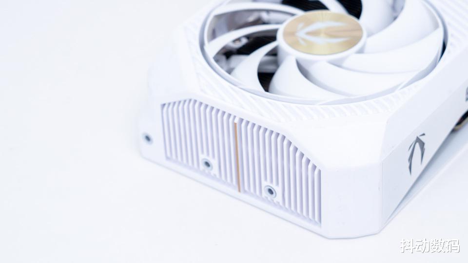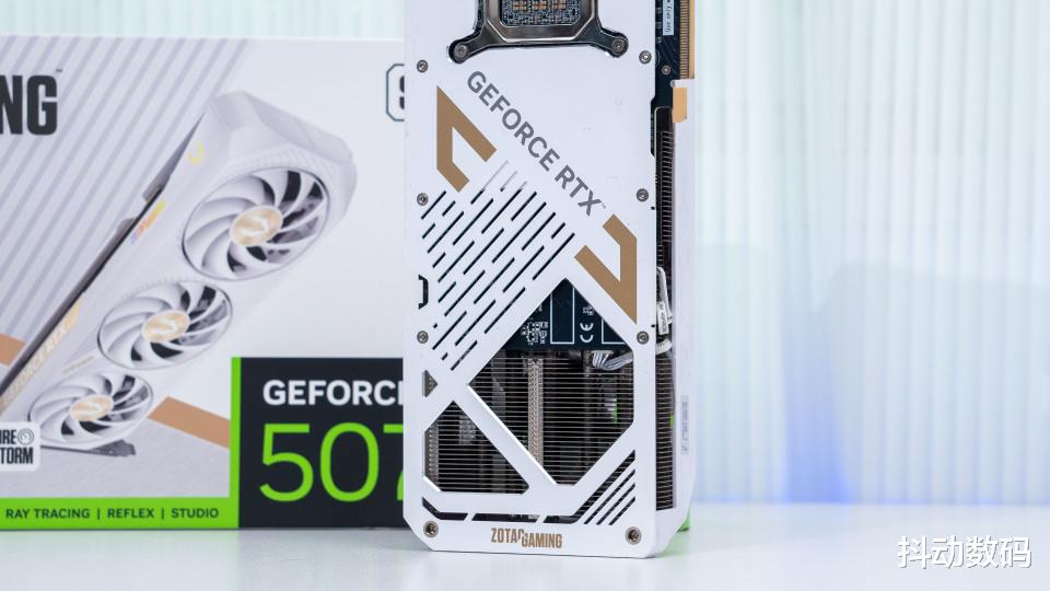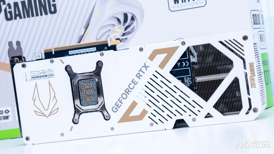 金属背板自然也是标配,白色的金属背板点缀金色装饰效果。显卡的尾端同样做了栅格化的镂空处理,进一步优化气流风道。