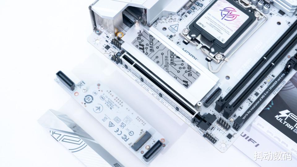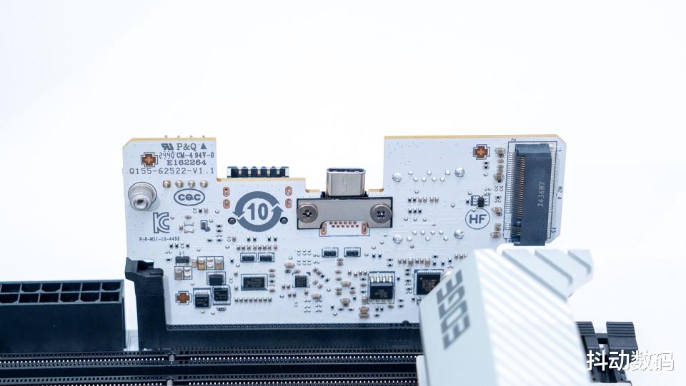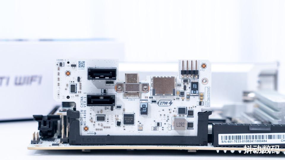 一样是白色的PCB设计,除了实现了主板前置USB 20Gbps Type-C接口、一个USB 5Gbps Type-C接口、两个SATA接口以及一个JAF_2扩展接口。