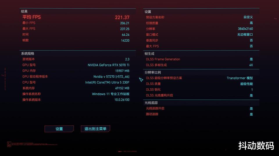 「2077」游戏4K 分辨率下开启光追的情况下,开启DLSS 4游戏平均帧数达到了221.37 FPS,最低帧数206.21 FPS。