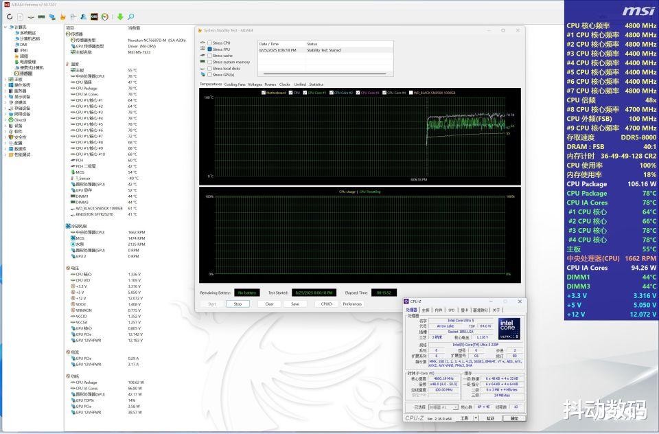 AIDA 64的FPU单烤测试下,intel Ultra 5 230F 处理器TDP 110W左右,频率4.8GHz,温度78℃。