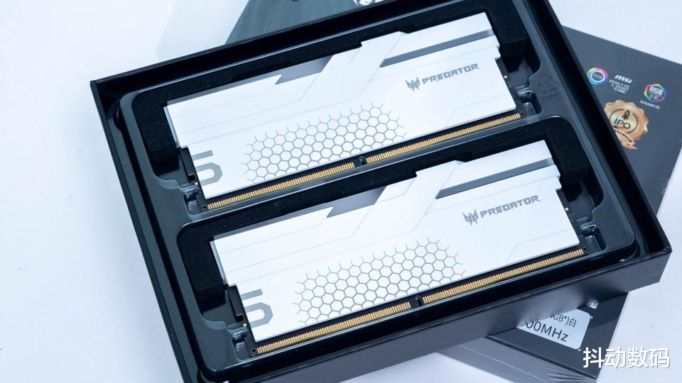我这套是白色版本的Hermes冰刃,另外还有黑色的选择。黑色版本表面采用类肤质材质,白色版本则是类似钢琴烤漆材质,内存正面用金属的蜂窝装饰。内存整体分量很足,也说明其散热片的用量不错,可以充分的保证内存温度不会过热。