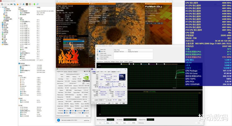 双烤测试下,intel Ultra 5 230F 处理器TDP 110W左右,频率4.8GHz,温度81℃。索泰 RTX 5070 Ti SOLID OC TDP 300W,显卡频率 2550MHz,显卡温度81℃。整机功耗大概400W。