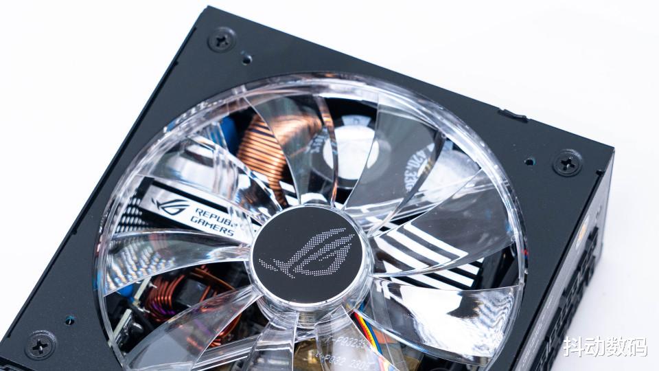拆卸后可以看到内部的12cm直径风扇,以及内部供电。供电散热部分还做了ROG图案装饰。