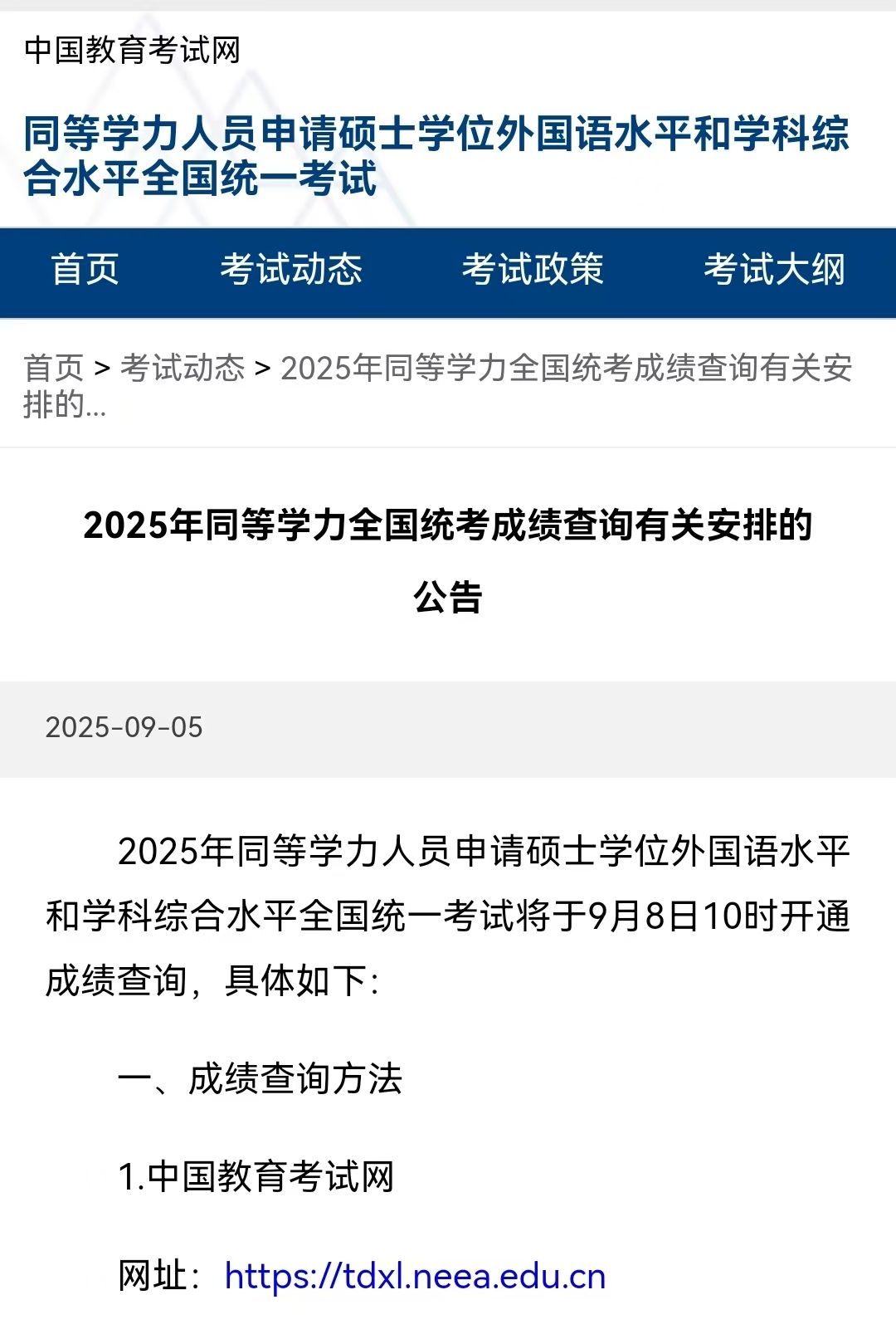2025年同等学力人员申请硕士学位外国语水平和学科综合水平全国统一考试将于9月8日10时开通成绩查询。