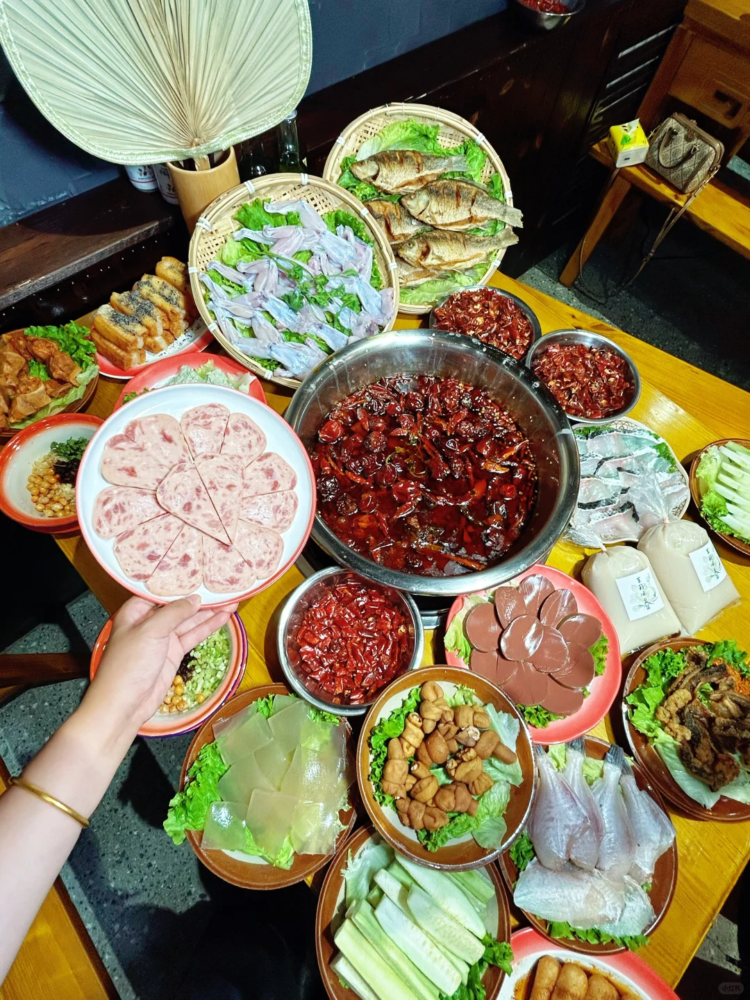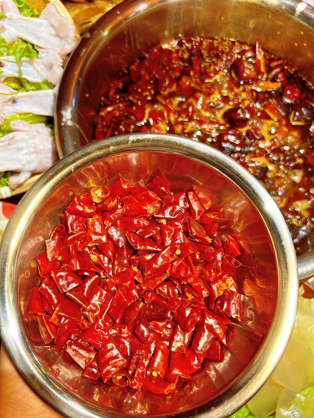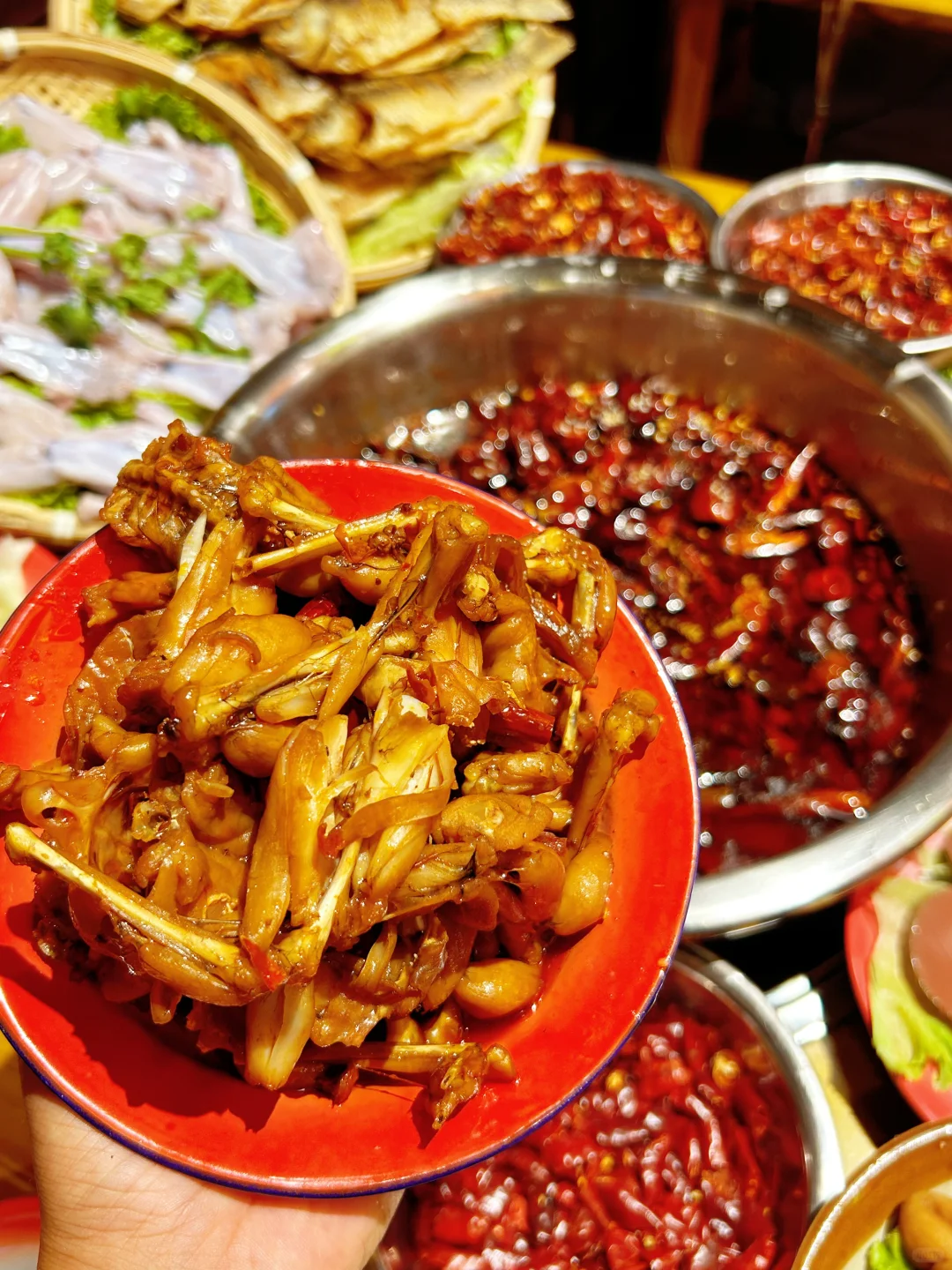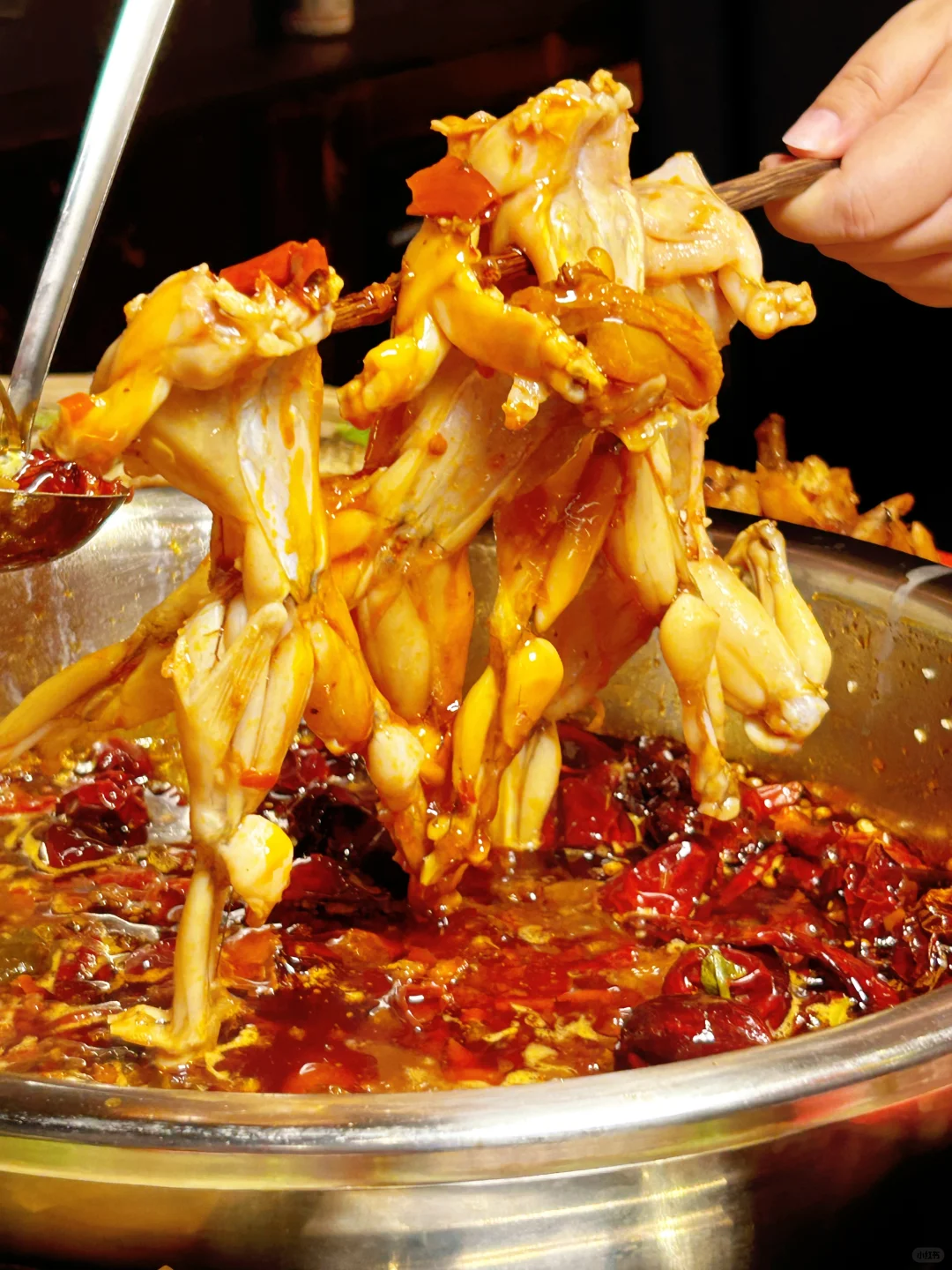 一进店,水煮蛙香辣锅底味道扑鼻而来,牛蛙鲜活还会动啊[哇R],底料现场炒制,浇上热油,唰啦啦~好香啊 ~😋