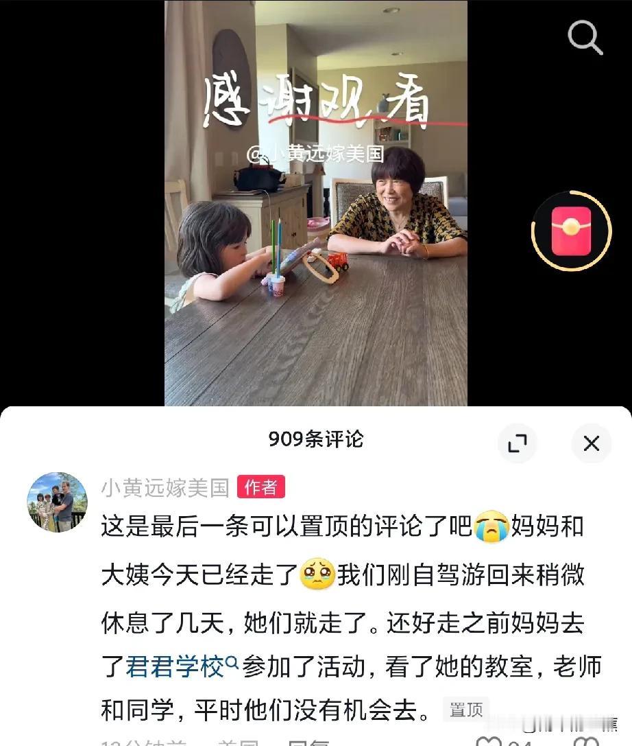 转眼间,小黄的妈妈和大姨就回国了,网友们讨论小黄不该让妈妈和大姨饭后刷碗的事好像就发生在昨天。那些争议声仿佛还在耳畔回响,然而时间过得太快,两位老人都回国了。 外婆回国了,孩子们应该要段时间适应了,毕竟在一起呆了几个月,网友们都舍不得,更别说君君和弟弟了。 妈妈这趟美国之行,看到小黄生活幸福安逸,应该很放心了。她看到了女儿拥有一个美满的家庭和稳定的生活。这份安心会化作无尽的思念,在遥远的中国默默地守护着她。@小黄远嫁美国 #小黄#