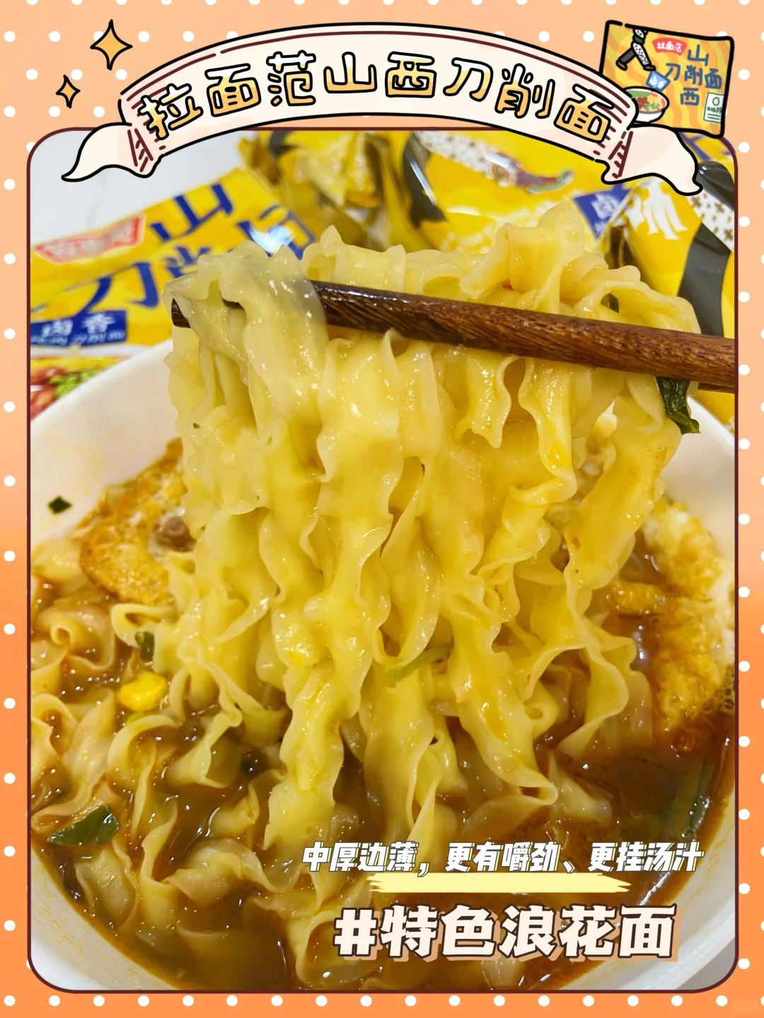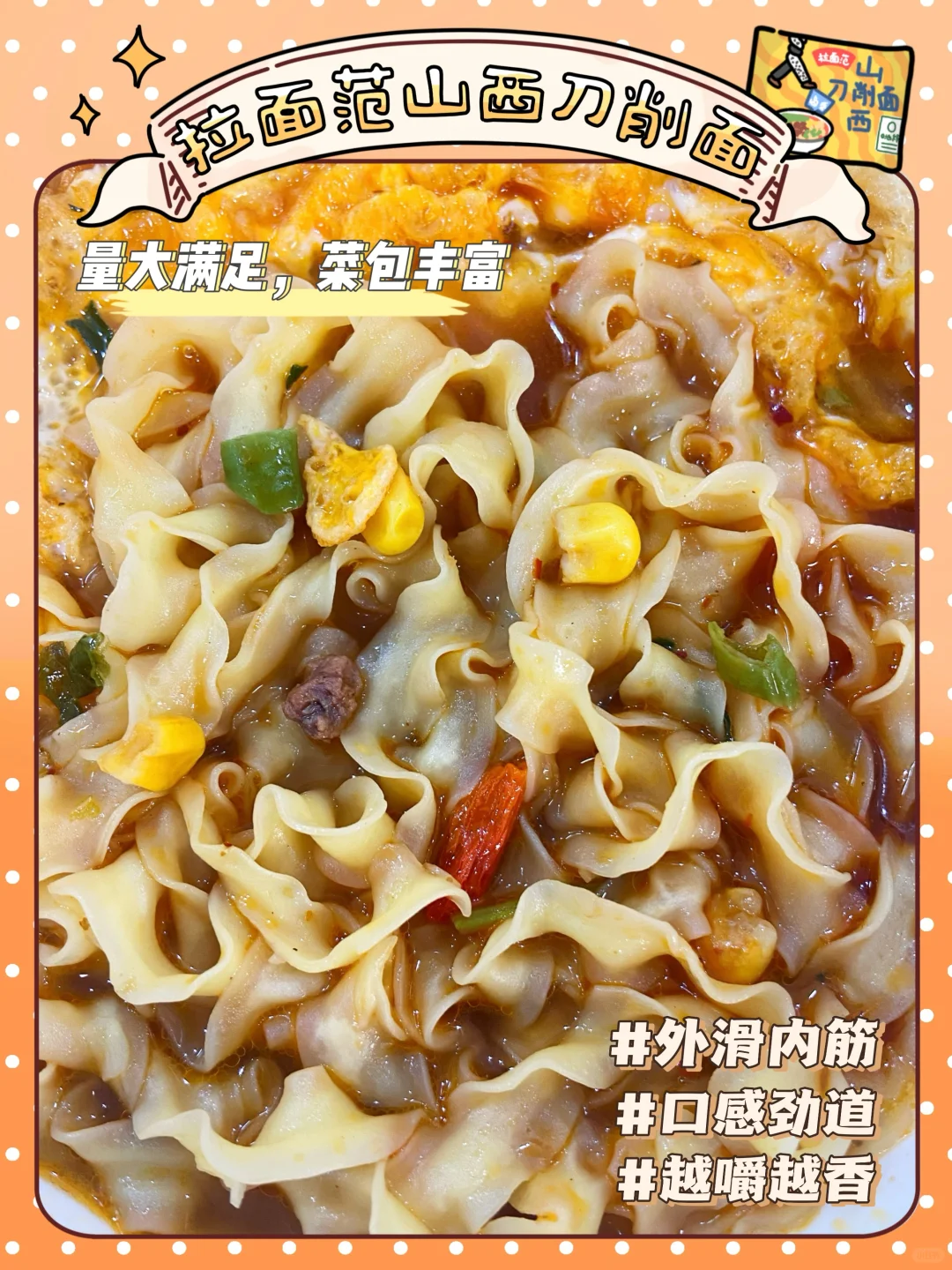 有一说一这个拉面范山西刀削面真的太香了‼️本柚子特别喜欢山西特色的面条,这种外滑内筋、软而不粘的口感👍越嚼越香 完全吃不够🤤而且面饼是非油炸的,自带浪花般的卷边,中厚边薄,非常挂汁💖我晚上库库能干两碗🥣Q弹劲道的面条🍜很有现擀面的口感(自带灵魂醋包 地道山西陈醋 酸爽过瘾 一口惊艳)