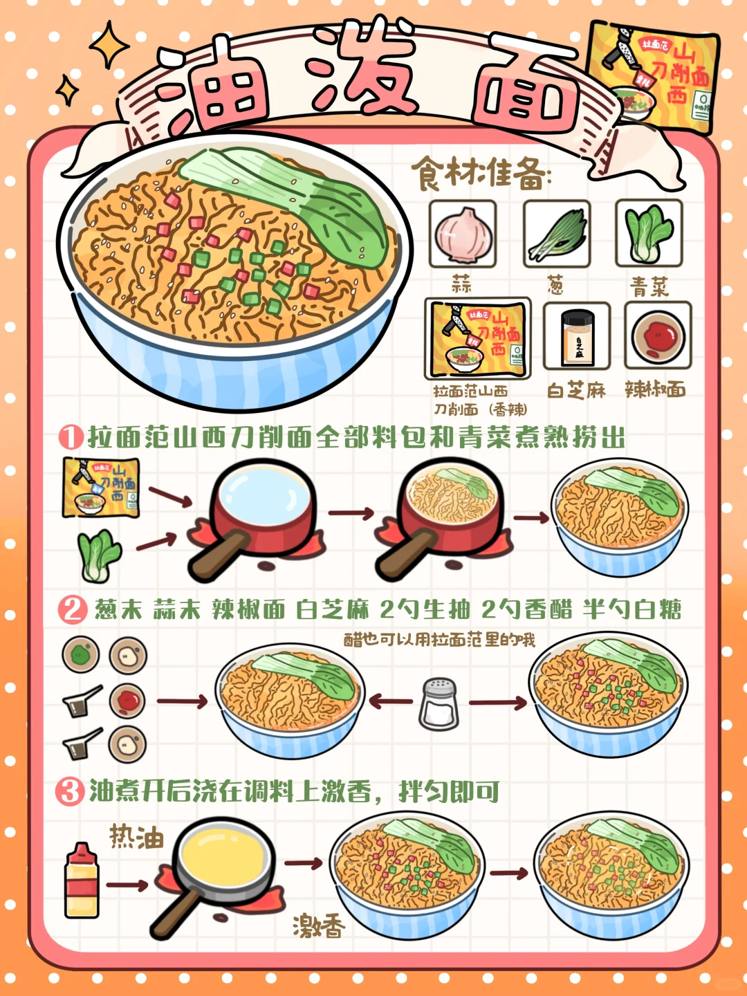 1️⃣蒜末 葱花 辣椒面 白芝麻淋热油激香 加入2勺生抽 2勺香醋(也可以用刀削面里自带的醋包) 半勺蚝油 半勺白糖拌匀
