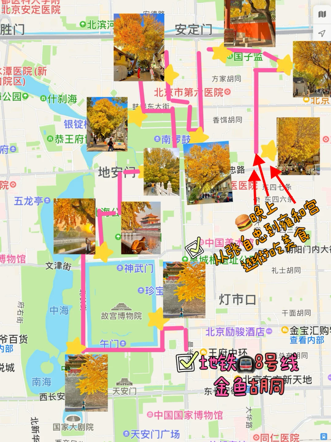 故宫东华门➡️故宫西华门➡️故宫角楼➡️神武门➡️东不压桥胡同➡️宝钞胡同➡️北锣鼓巷➡菊儿胡同➡️北新桥三条➡️国子监街➡️青龙胡同➡️门楼胡同➡️东四十二条
