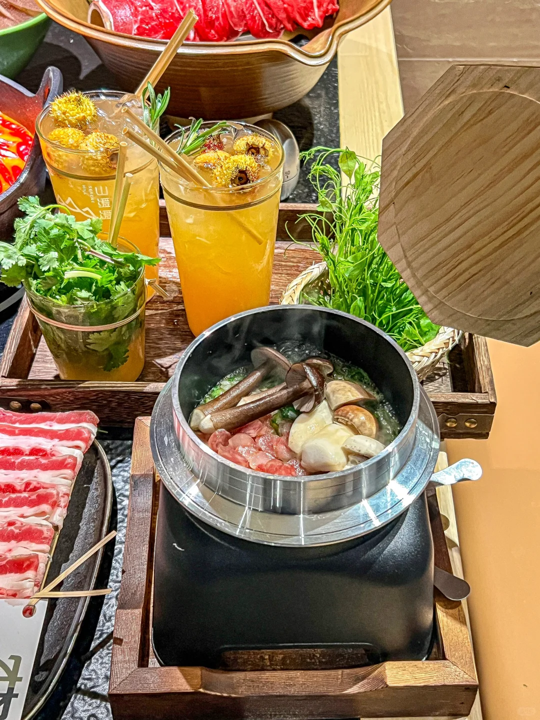 卧卧卧!终于在徐州文庙吃到了正儿八经的山野火锅….. ✔️九秒牛肉、山葵牛肉、木姜子牛肉🥩都是鲜切的又鲜又嫩🤤越嚼越香……再蘸上小料 绝👍 ✔️ 他们家的菌子要尝一下!一次可以尝到6种~放到草本原汤里涮尊嘟好鲜美! ✔️漂亮饮料也是猎奇又好喝!香菜🌿香水柠檬🍋茶、折耳根米乳茶🤤在别的地方根本喝不到哦~这家是我会一直反复来吃的!
