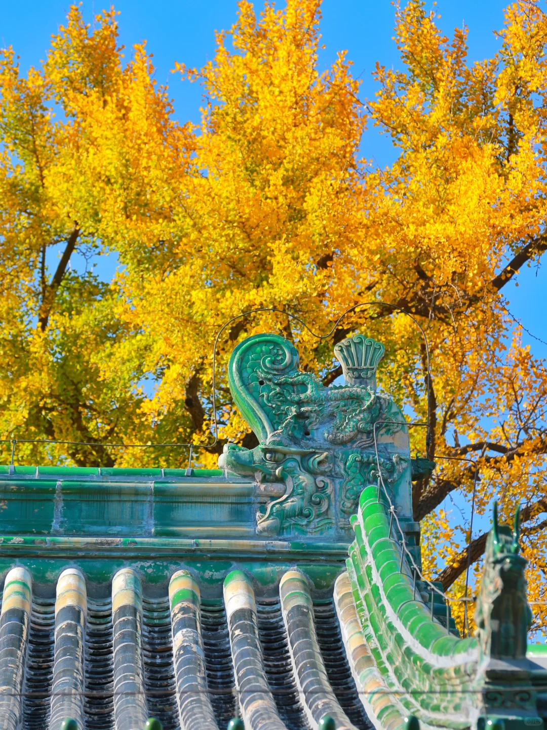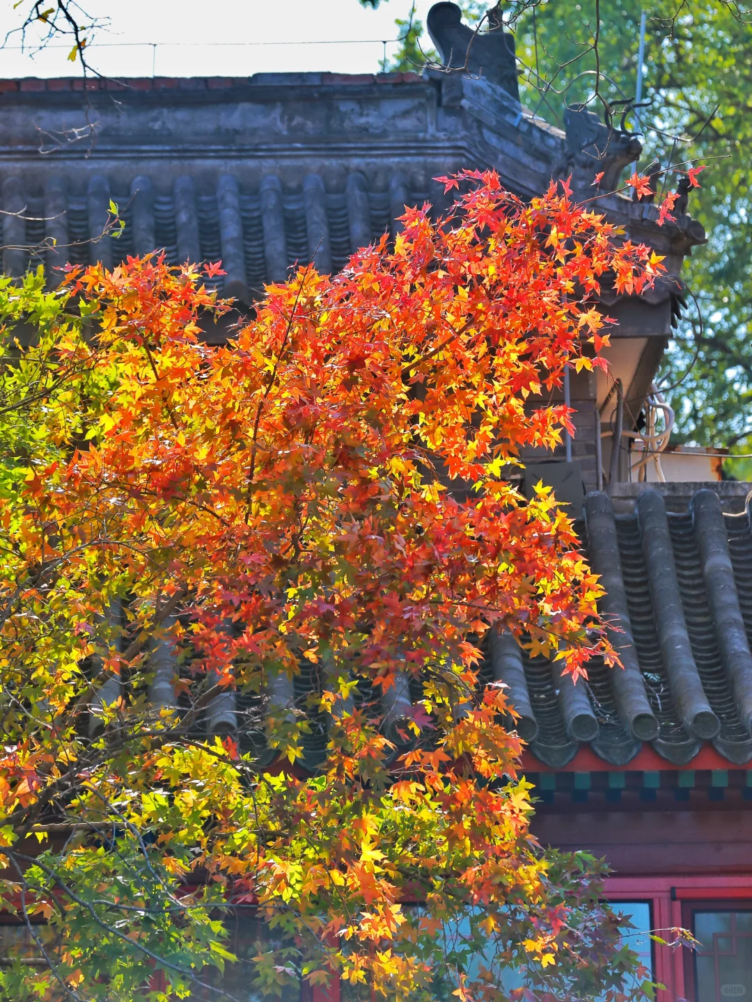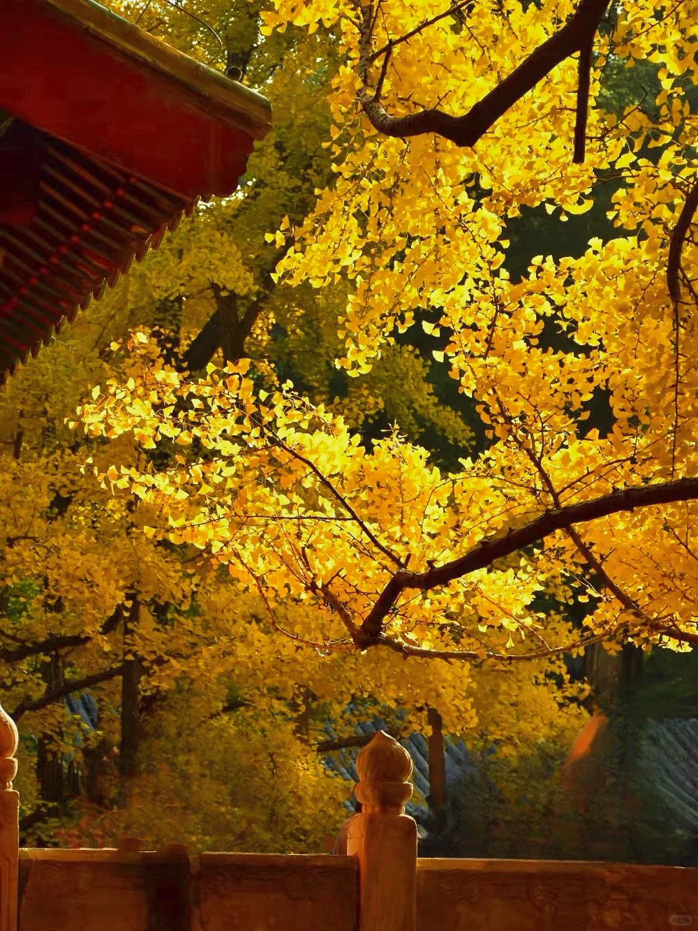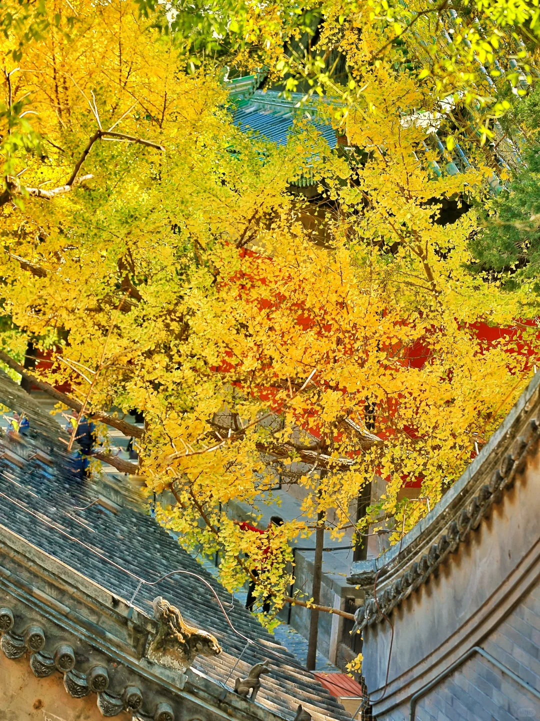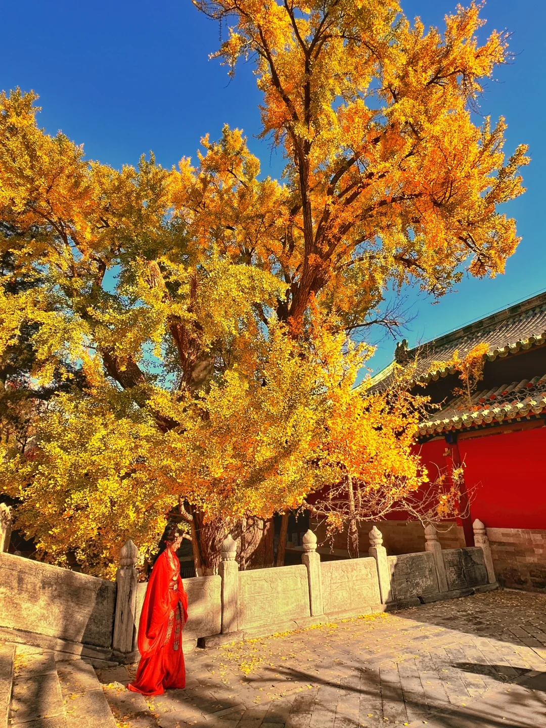 大家好大觉寺,两株大银杏已经巅峰,五角枫叶红绿相间