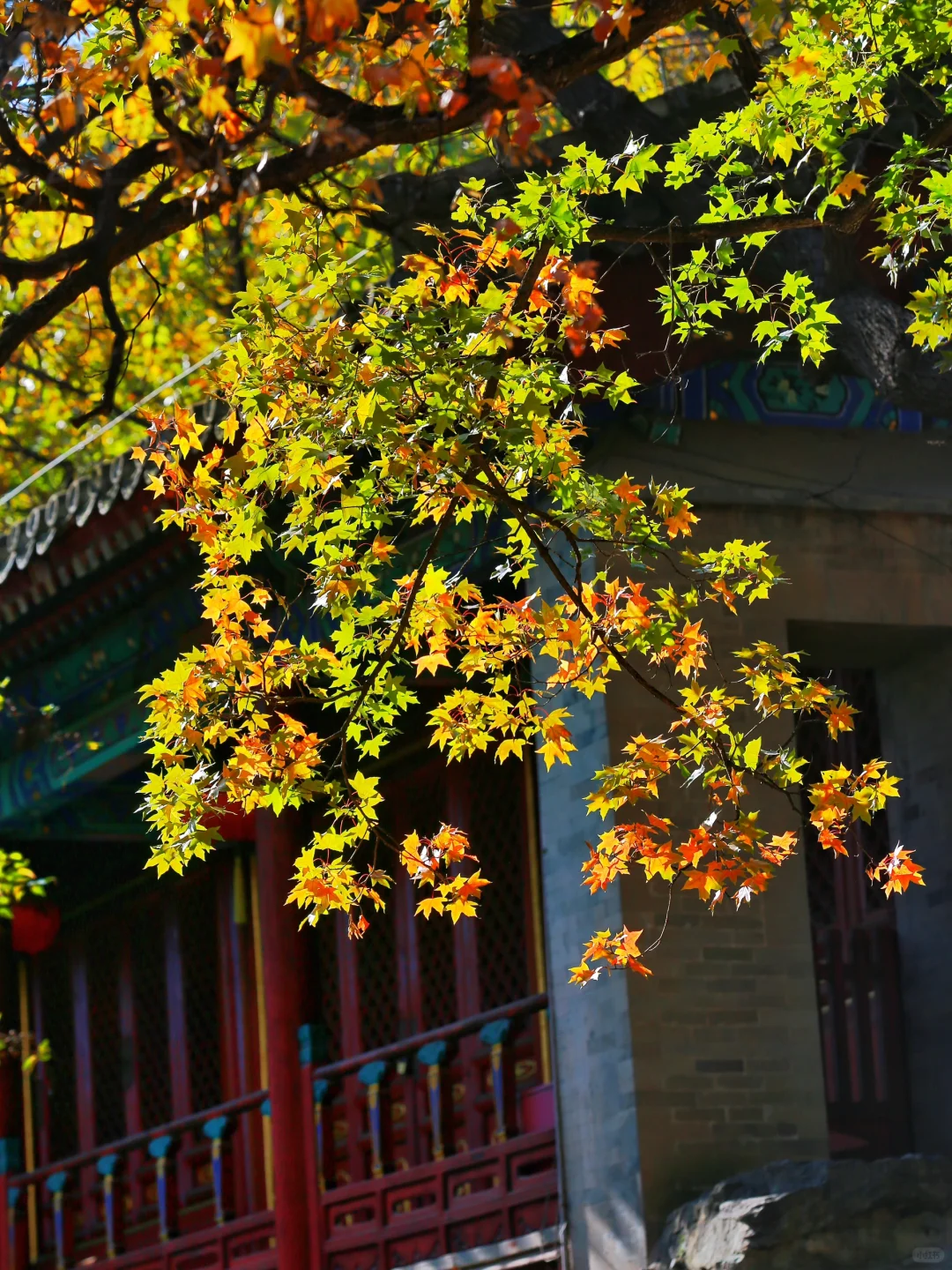 📷打卡机位2、进门的,南碑亭 鱼池旁红叶本周峰值,红枫光影和石阶红柱蓝瓦呼应拍照很漂亮