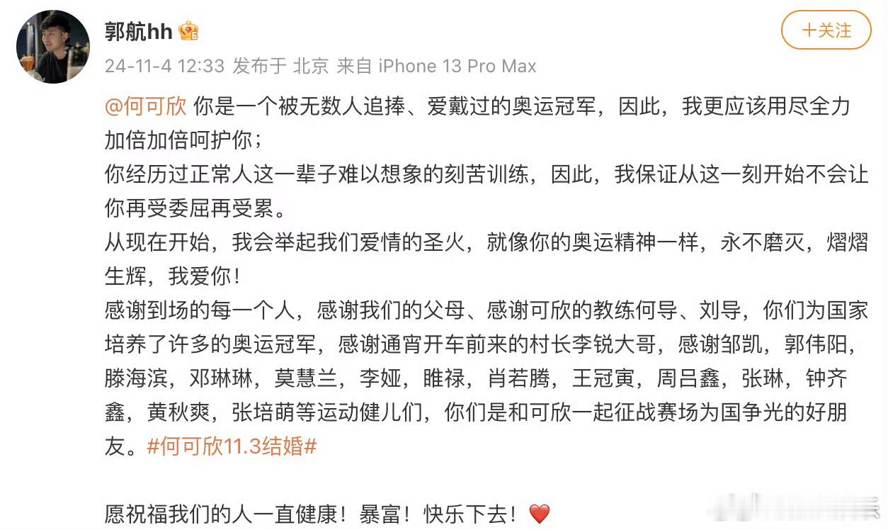 #何可欣官宣结婚##何可欣郭航结婚#4日,奥运体操冠军晒出昨天婚礼的照片,官宣结婚喜讯。新郎也发文表白:“你是一个被无数人追捧、爱戴过的奥运冠军,你经历过正常人这一辈子难以想象的刻苦训练,因此,我保证从这一刻开始不会让你再受委屈再受累,我更应该用尽全力加倍加倍呵护你。从现在开始,我会举起我们爱情的圣火,就像你的奥运精神一样,永不磨灭,熠熠生辉。”想不到奥运精神和婚礼也适配!恭喜[送花花]!