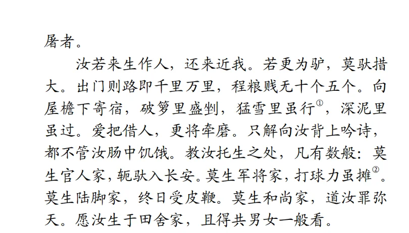 后面,作者对驴的来世做了美好的祝愿,希望他还能与自己为友,“汝若来生做人,还来近我。” 并且希望驴子不要生于官人家,将军家,和尚家,在这些人家里就没有好日子过。