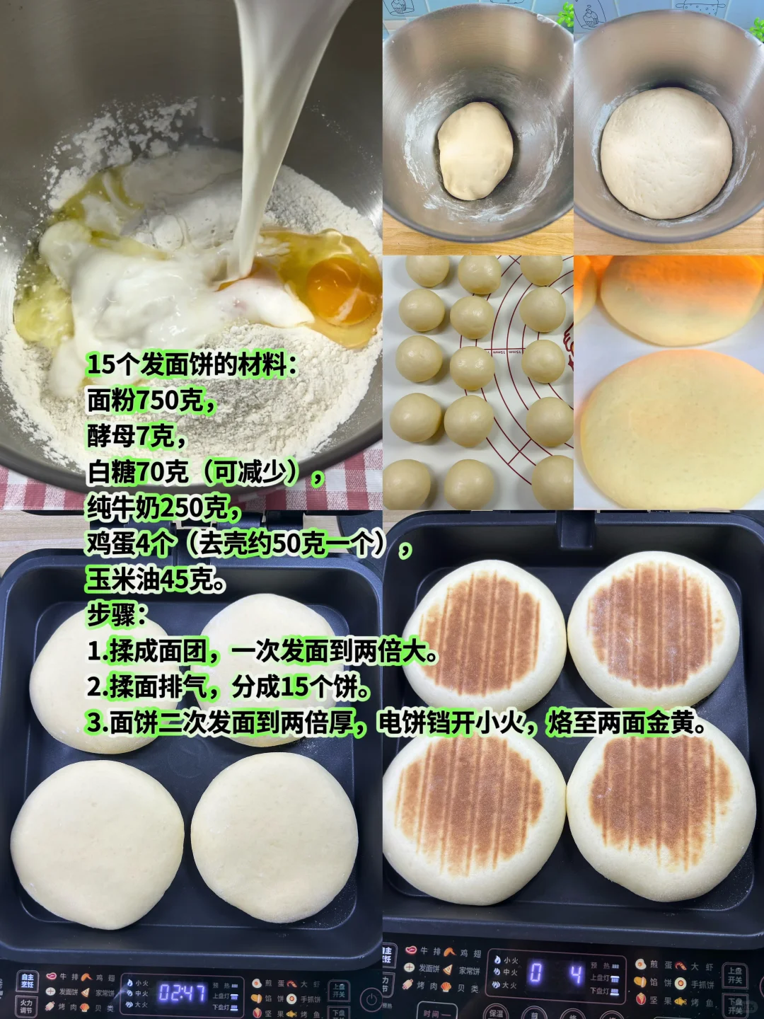 15个发面饼的材料: 面粉750克, 酵母7克, 白糖70克(可减少), 纯牛奶250克, 鸡蛋4个(去壳约50克一个), 玉米油45克。 步骤: 1.揉成面团,一次发面到两倍大。 2.揉面排气,分成15个饼。 3.面饼二次发面到两倍厚,电饼铛或平底锅开小火,烙至两面金黄。