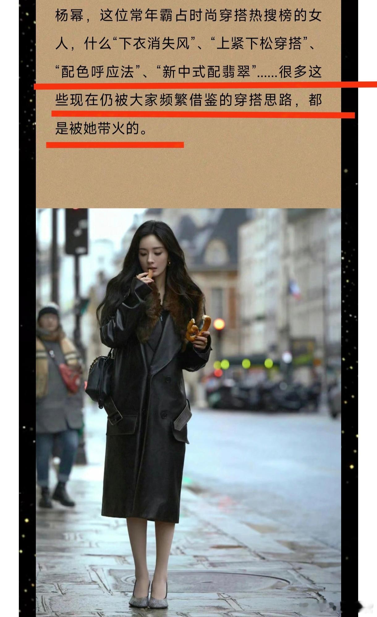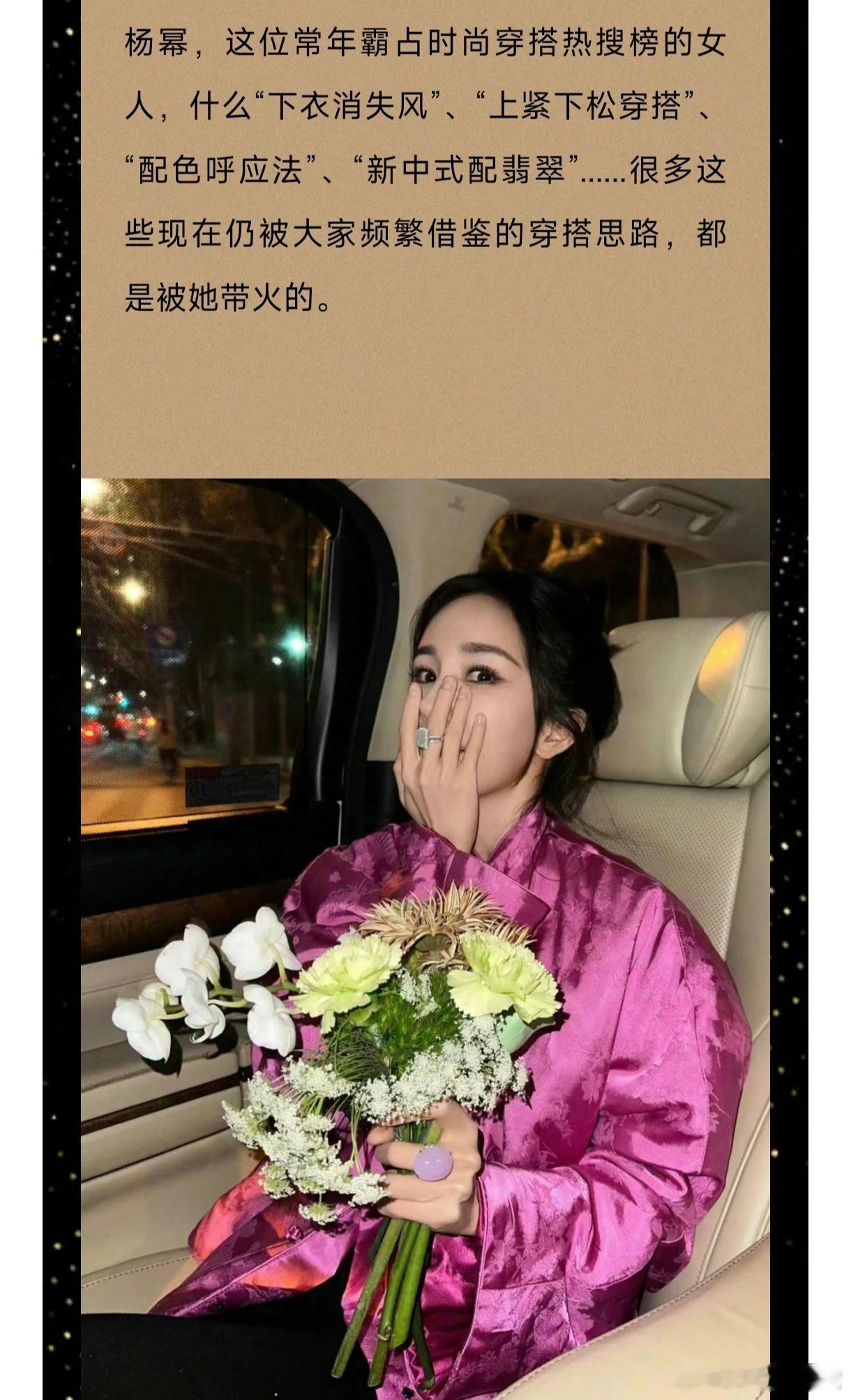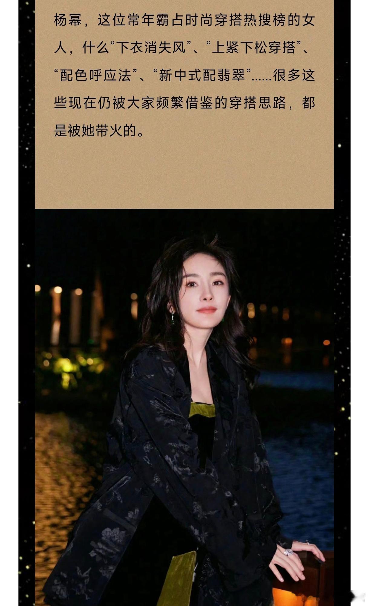 什么“下衣消失风”、“上紧下松穿搭”、“配色呼应法”、“新中式配翡翠”......很多这些现在仍被大家频繁借鉴的穿搭思路,都是被杨幂带火的!