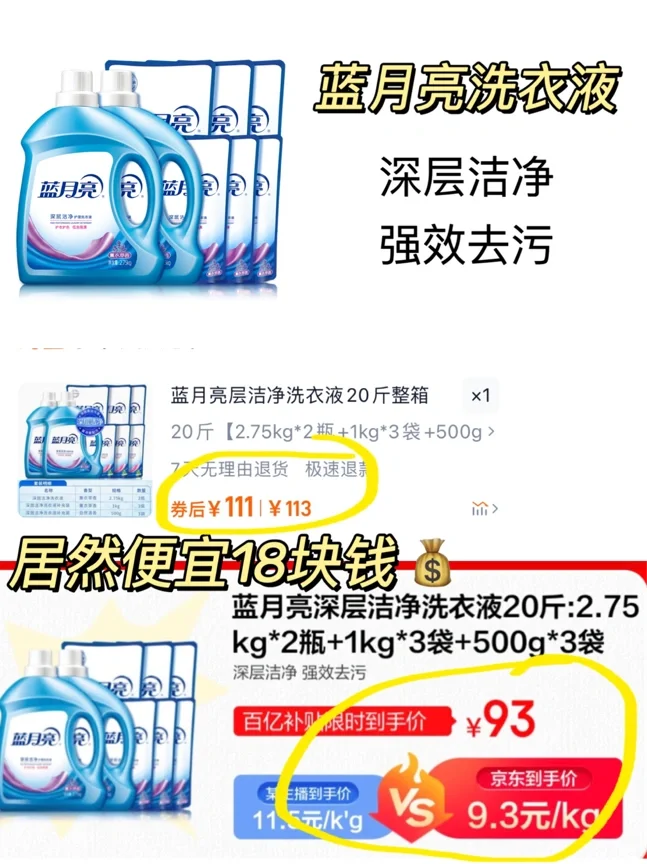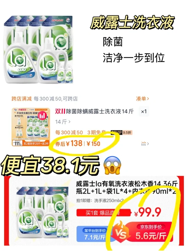作为薅羊毛专业户! 我可不会错过任何一个可以省钱的好机会! 这次我专门列个清单把家里需要的都写上: 各种做足功课在不同平台比价!! - 👉🏻维达厨房抽纸180抽*6提 某平台到手价:65.5💰 京东到手价:49.9💰 👉🏻蓝月亮深层洁净洗衣液 某平台到手价:11.5/k g💰 京东到手价:9.3/k g💰 👉🏻威露士la有氧洗衣液 某平台到手价:7.1/斤💰 京东到手价:5.6/斤💰 我直接把一年的洗衣液都囤出来了