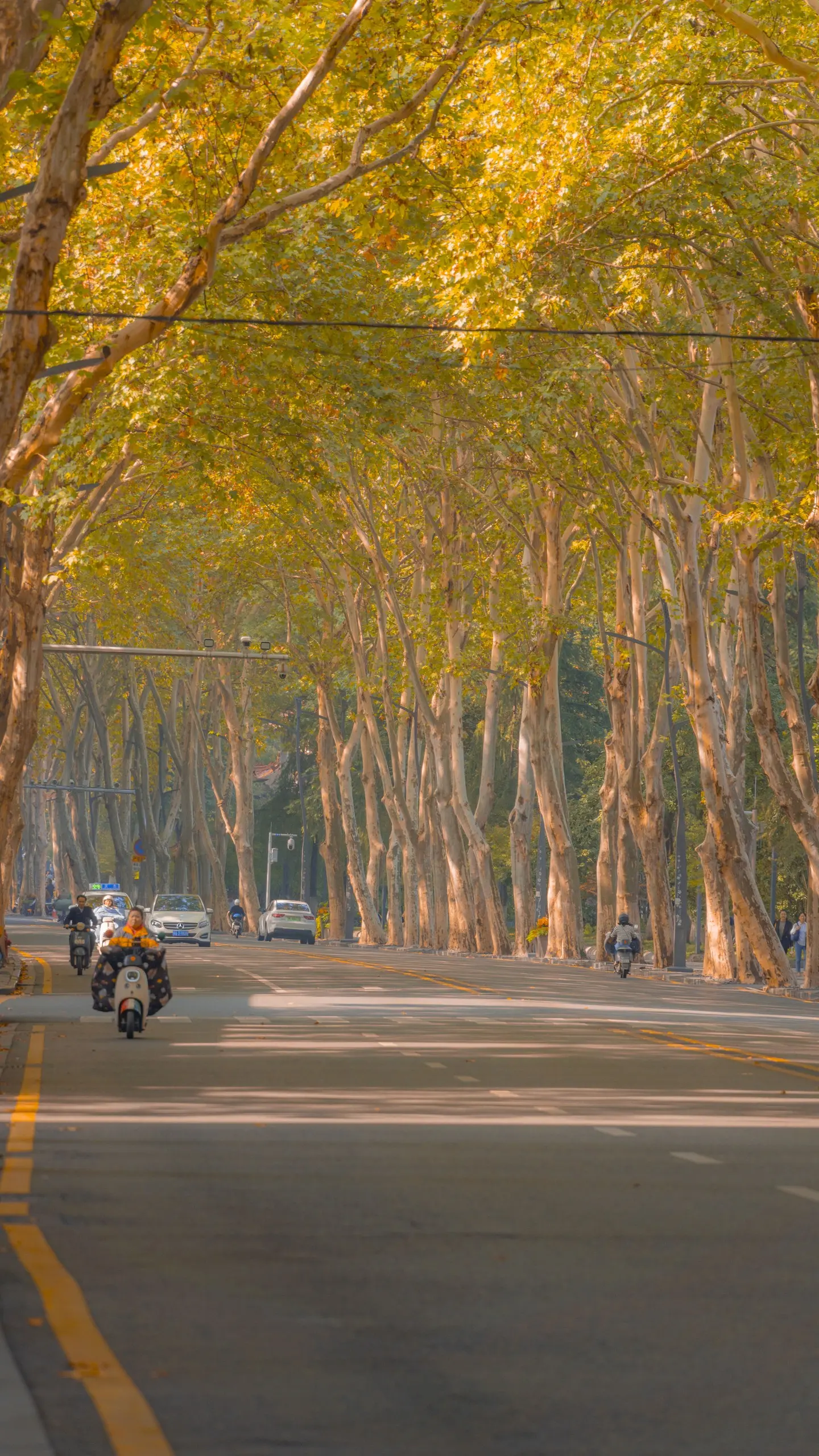 1️⃣道路中央:解放公园路的梧桐树高大且排列整齐,站在道路中央,以两排梧桐树为背景,拍出的照片具有很强的纵深感和对称美,仿佛置身于一条金色的隧道之中。