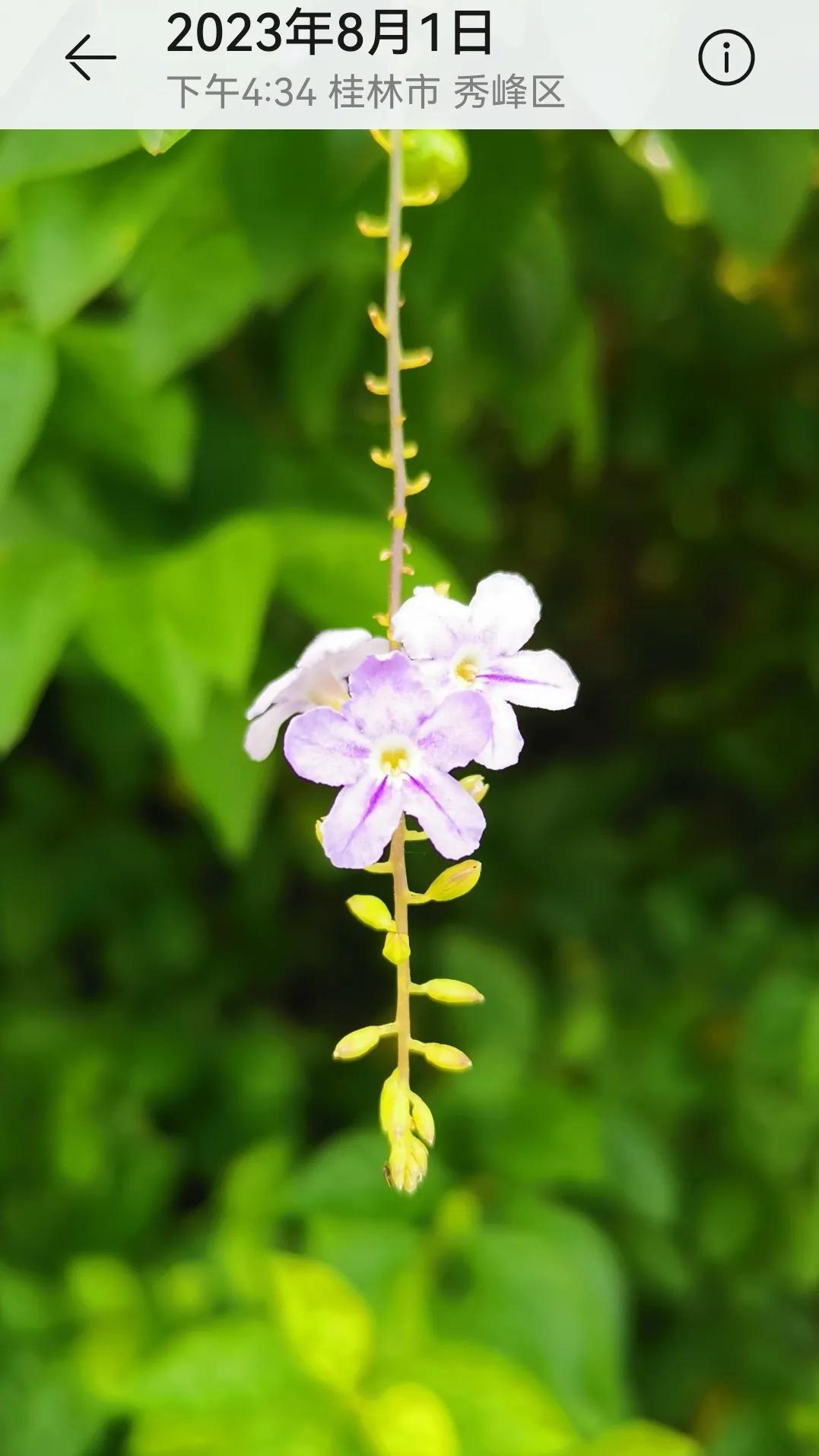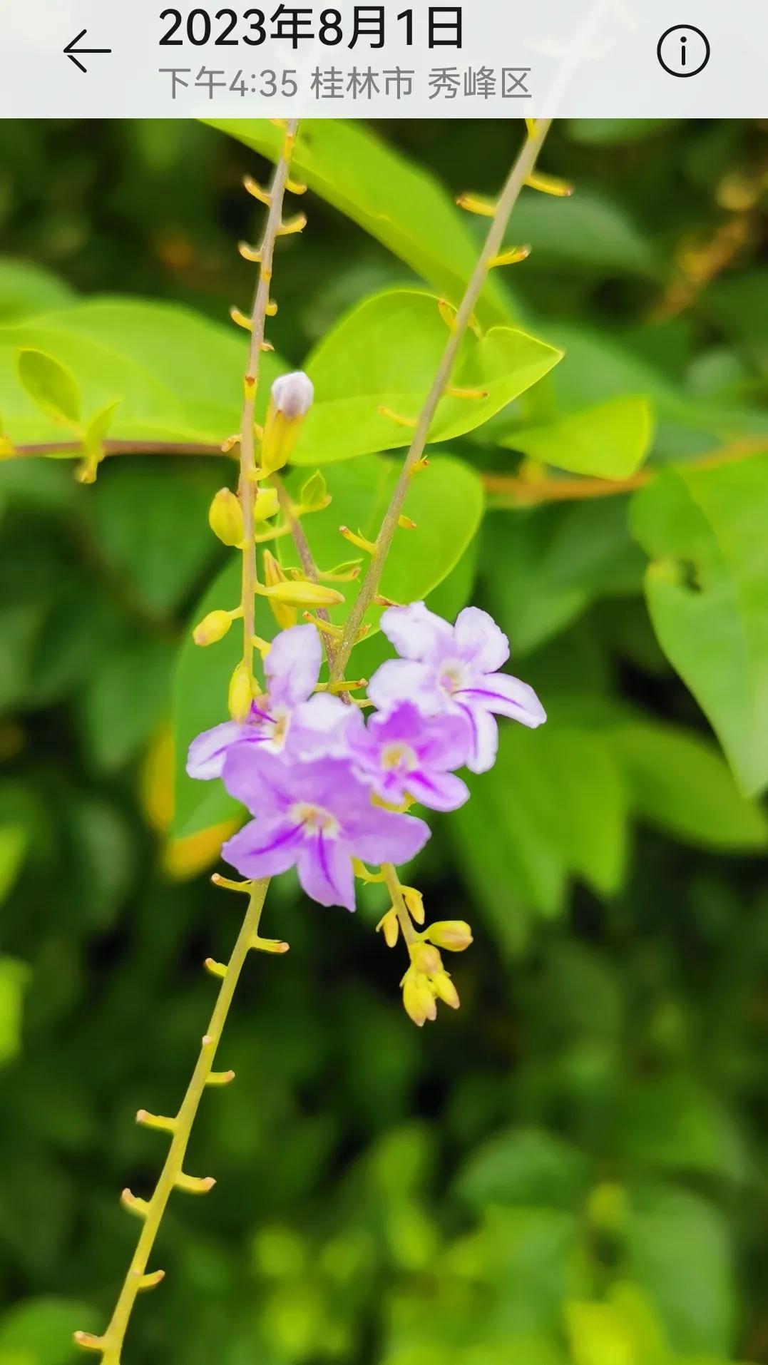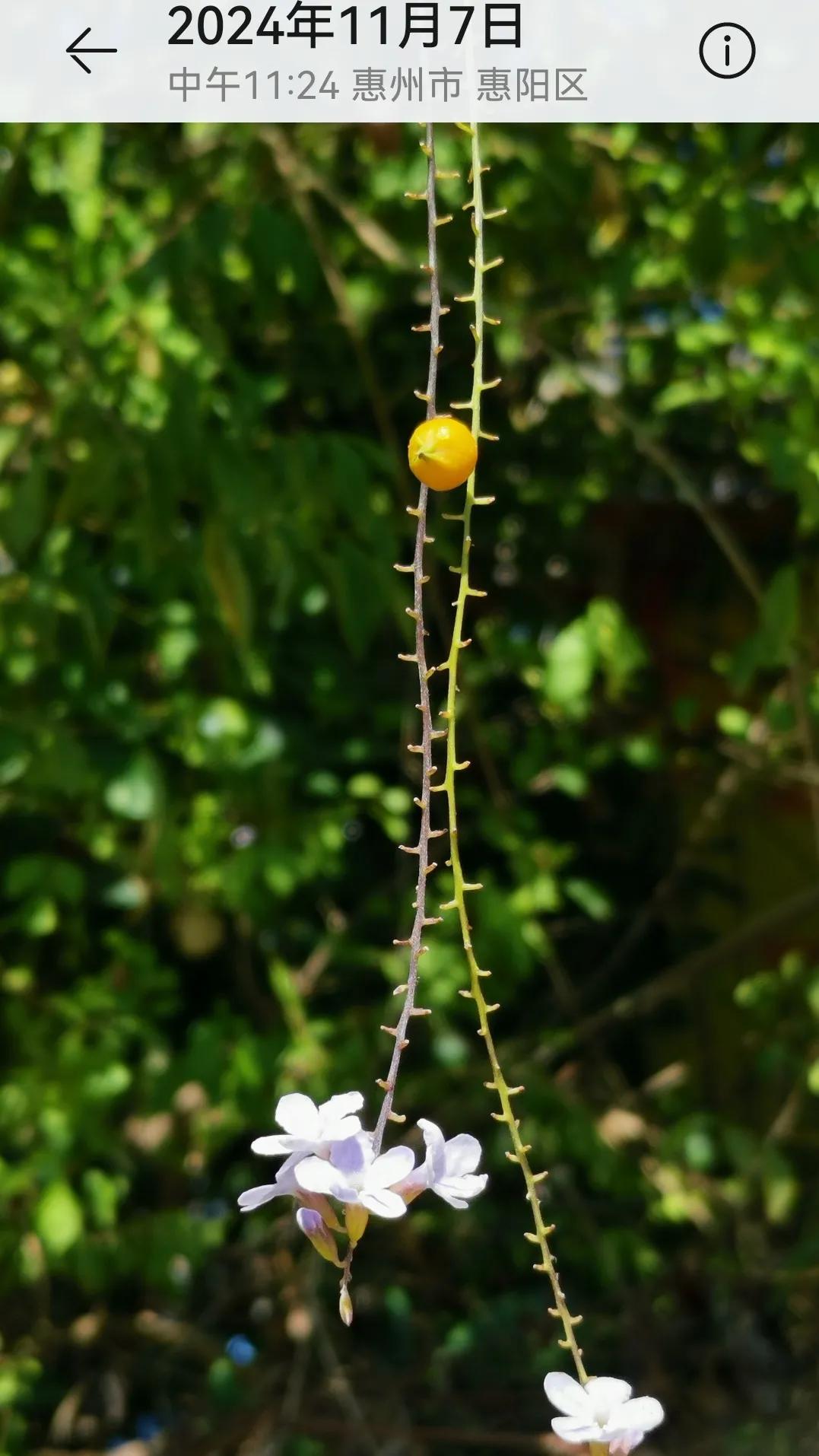今天在路边看到一种植物,长长的下垂枝条,有刺,枝条端部开有白中带紫的小花,还结有橘黄色的小果子。 看着看着,突然觉得似曾相识。 在手机相册里翻找了好一会儿,果真,去年在桂林看到过同一种植物。 它叫“假连翘”,但它和连翘既不同科,也不同属,风马牛不相及,也不知道是谁给它取的这个名字。 另外,假连翘原产于热带美洲,那它在原产地叫什么名字呢?