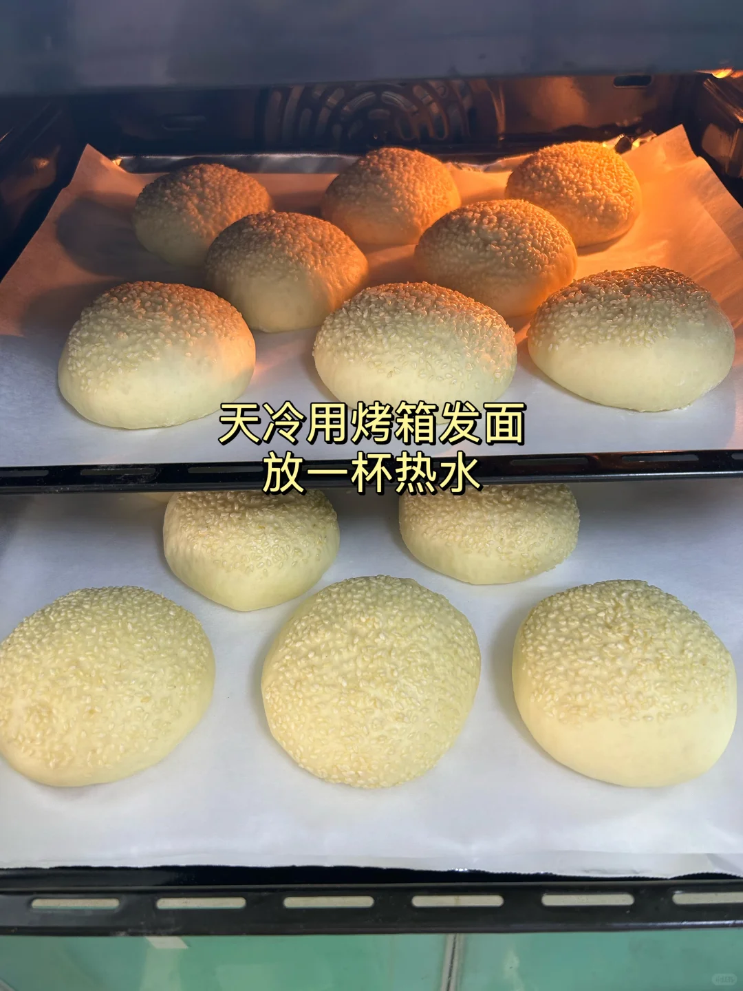 2.分成16份,沾水再沾芝麻,发面到三倍大。