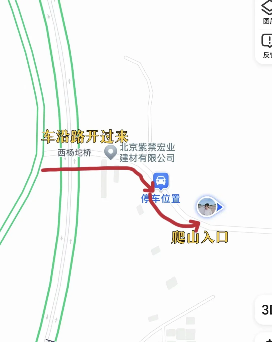 🗺️导航“东杨坨村北路”桥下右转,到达后继续前行 100米,很明显的一个上山入口。