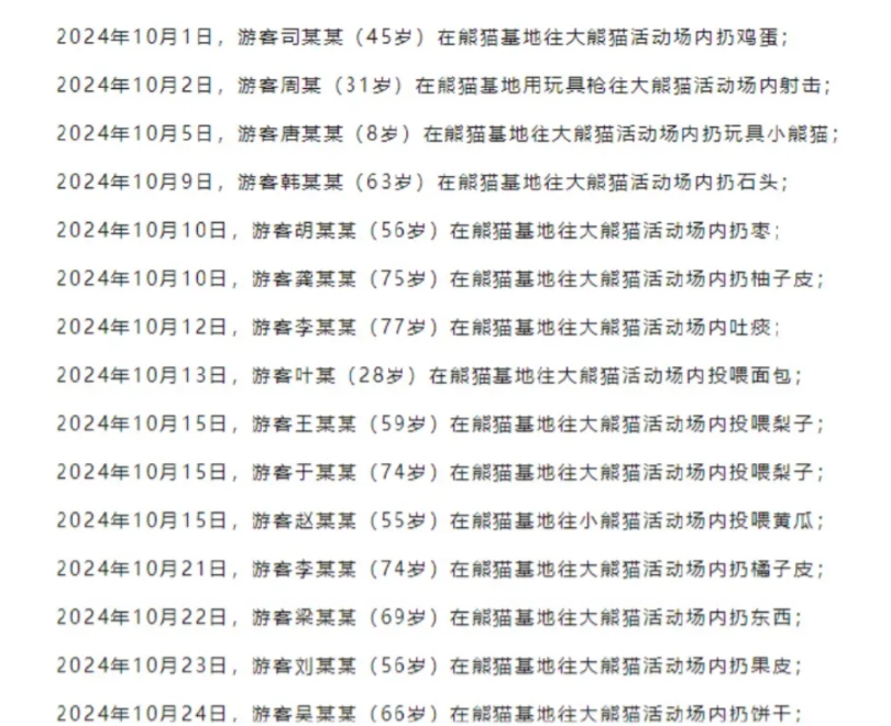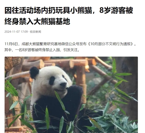 (信源:因往活动场内扔玩具小熊猫,8岁游客被终身禁入大熊猫基地——2024-11-07 ·极目新闻)