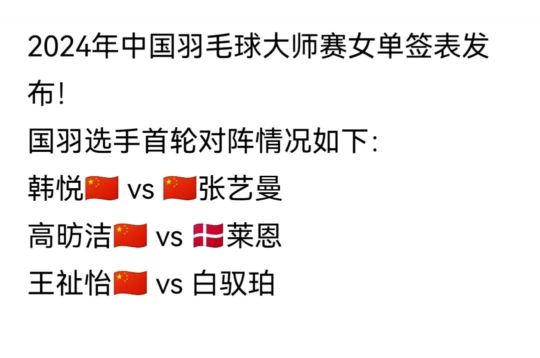 2024年中国羽毛球大师赛女单签表发布! 国羽选手首轮对阵情况如图一。 从2022年到今年的丹麦羽毛球公开赛,张艺曼🇨🇳前两轮一共遇到17次内战[捂脸],再加上这个中国大师赛第一轮遇上韩悦🇨🇳,就是18次了, 而且2022年前八站比赛的前两轮就和陈雨菲🇨🇳对阵了四次了[捂脸]。 2024年中国羽毛球大师赛将于11月19日-24日在深圳举行,属于超级750赛。