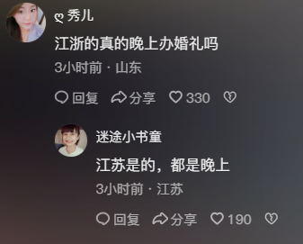 结果引发很多网友的热议,很多人纷纷表示自己当地的婚俗文化里;正式婚礼仪式的时间与大多数地方的不太一样, 比如东北、北京,婚礼早上举行的是一婚(头婚), 下午举行的就是二婚了。
