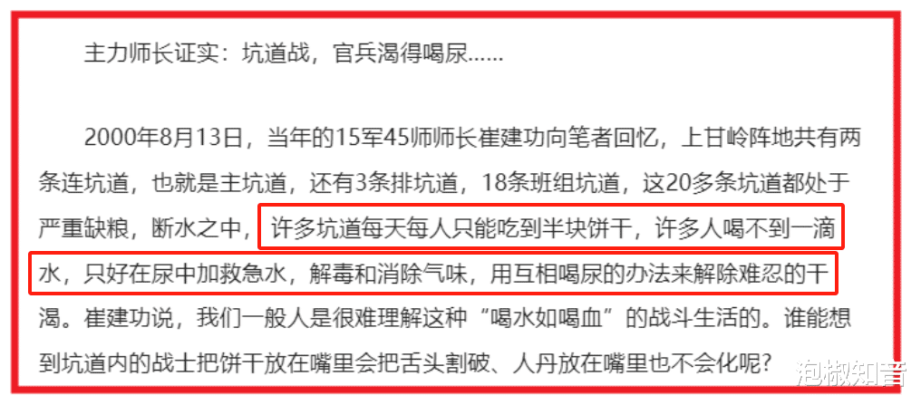 作为这场战争的亲历者的15军45师师长崔建功就回忆说当时的情况是严重缺粮、断水。战士们每天只能吃半块饼干,水源更是宝贵,坑道里的石壁上会渗出一点点的水滴,这些水滴会优先提供给伤员,而健康的战士压根没有水可以喝。