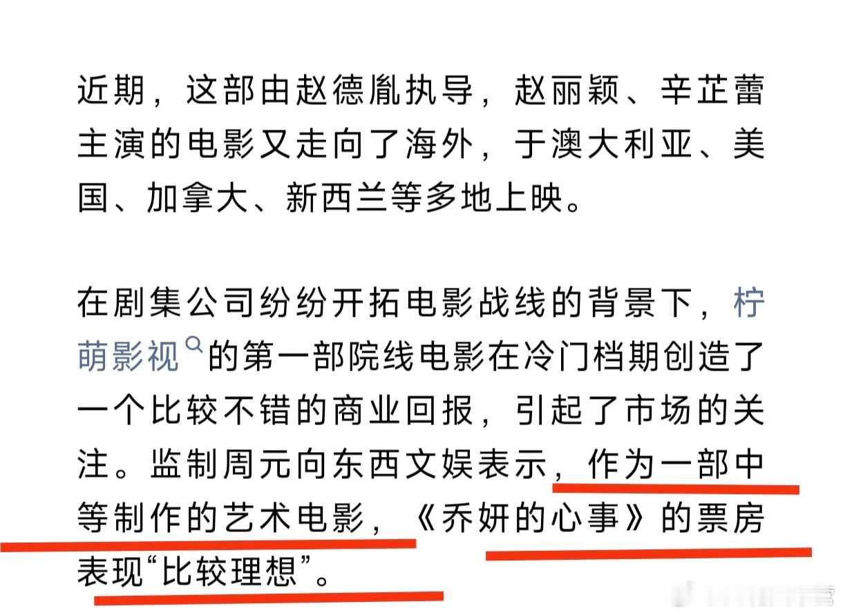 《乔妍的心事》在冷门档期创造了一个比较不错的商业回报,票房表现“比较理想”,是一个独特案例!