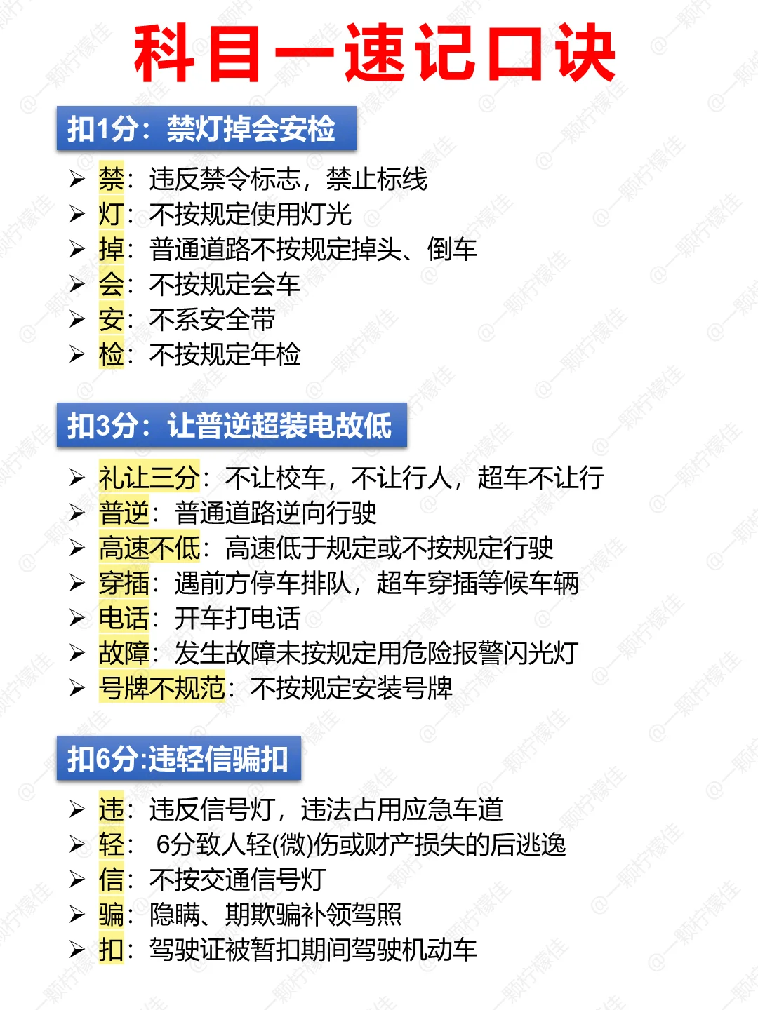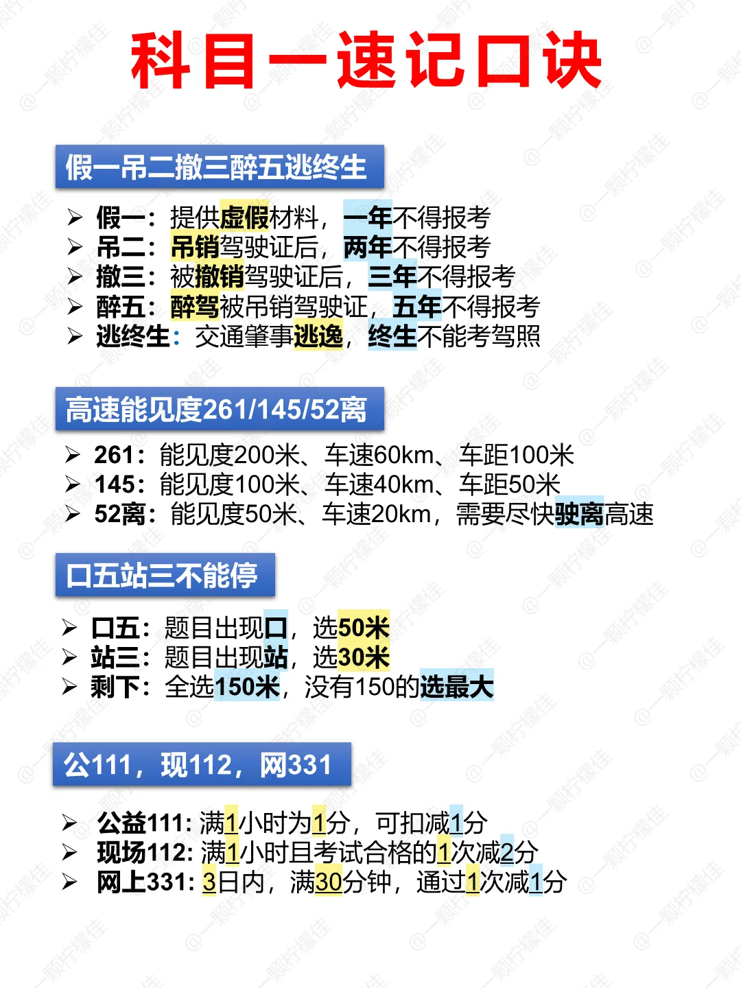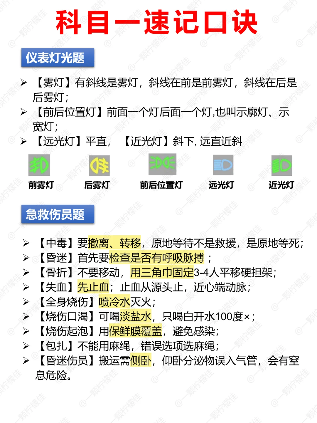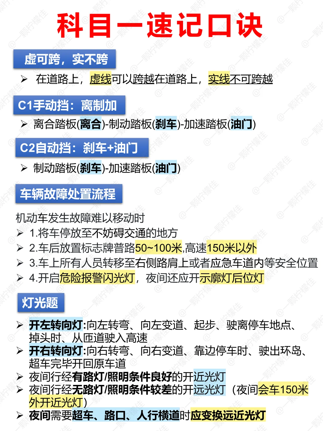宝子们!快来收走2024科目一懒人速记口诀,拿走不谢!😁 - 想轻松搞定科目一90%的考点? 来,看过来,这些都是看完肖~xiaoxiao~的科目一🎬视频后,整理出来的精华哦~~✏️ - 大家可以看完视频再刷题,效果杠杠的! 至于后面那些交通图标,可以直接存手机里,闲的时候翻一翻,加深记忆。 - 记得一定要把错题都过一遍哈,这样基本上就十拿九稳了。 - 祝宝子们科目一都能一把过,不挂科,加油鸭!🤛🏻🤛🏻🤛🏻🤛🏻