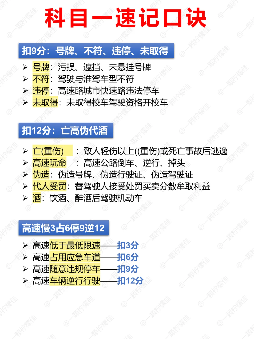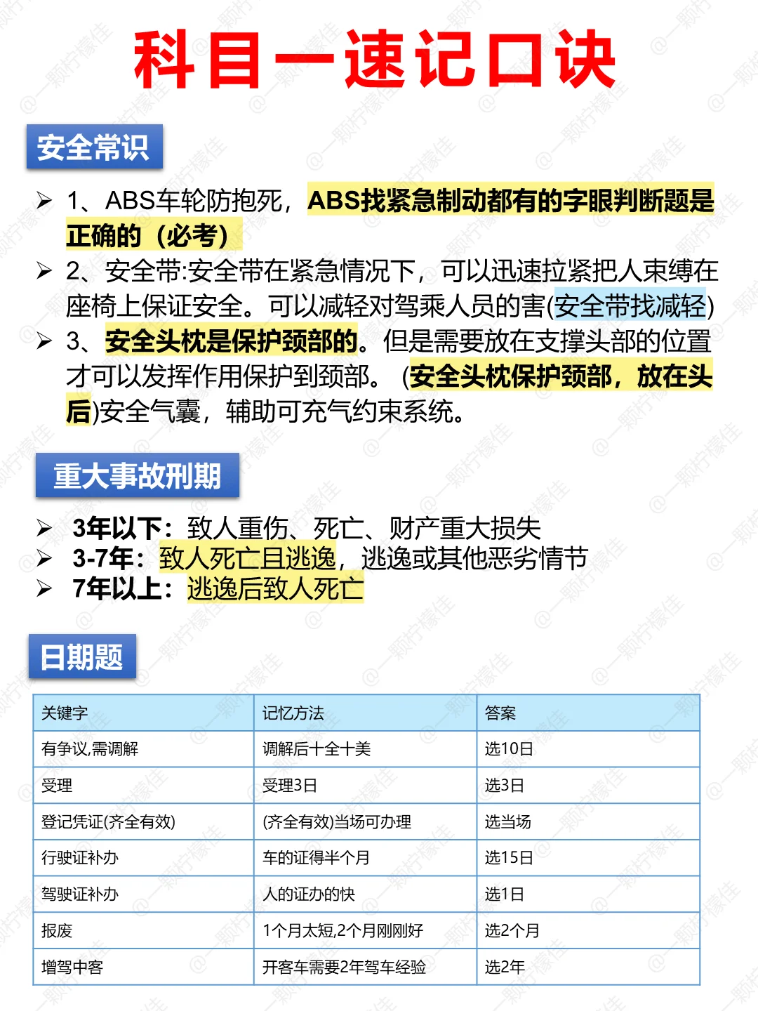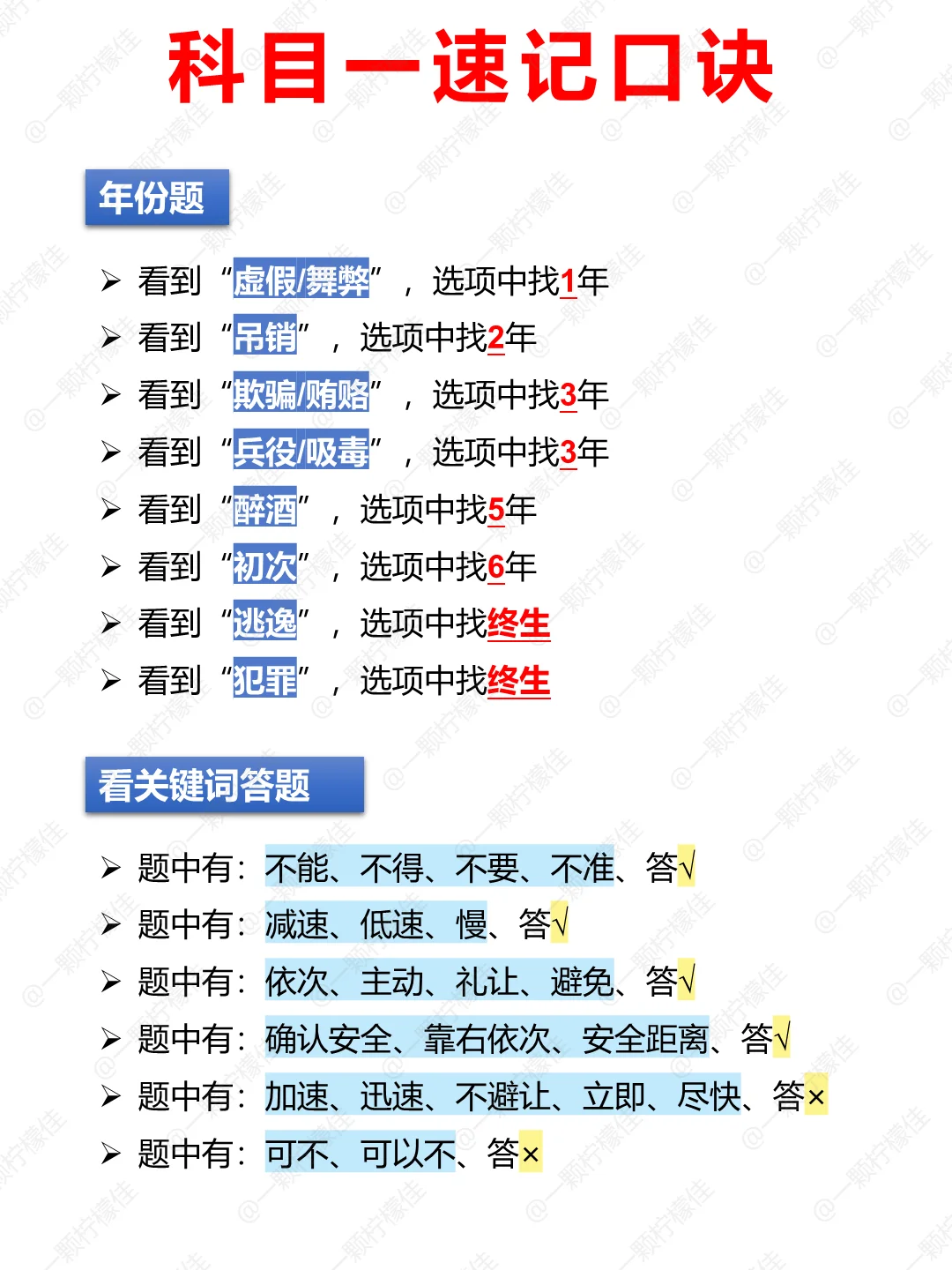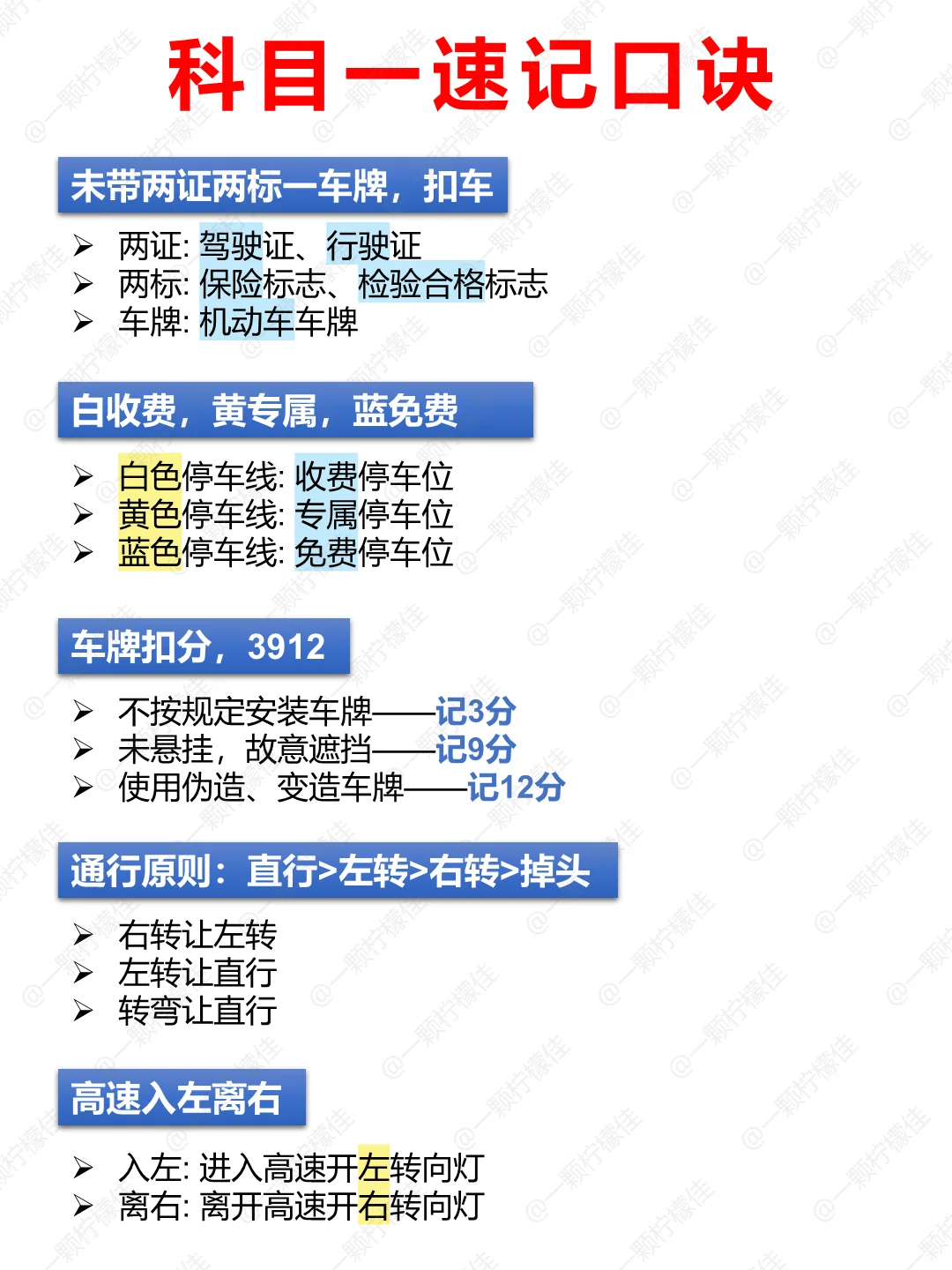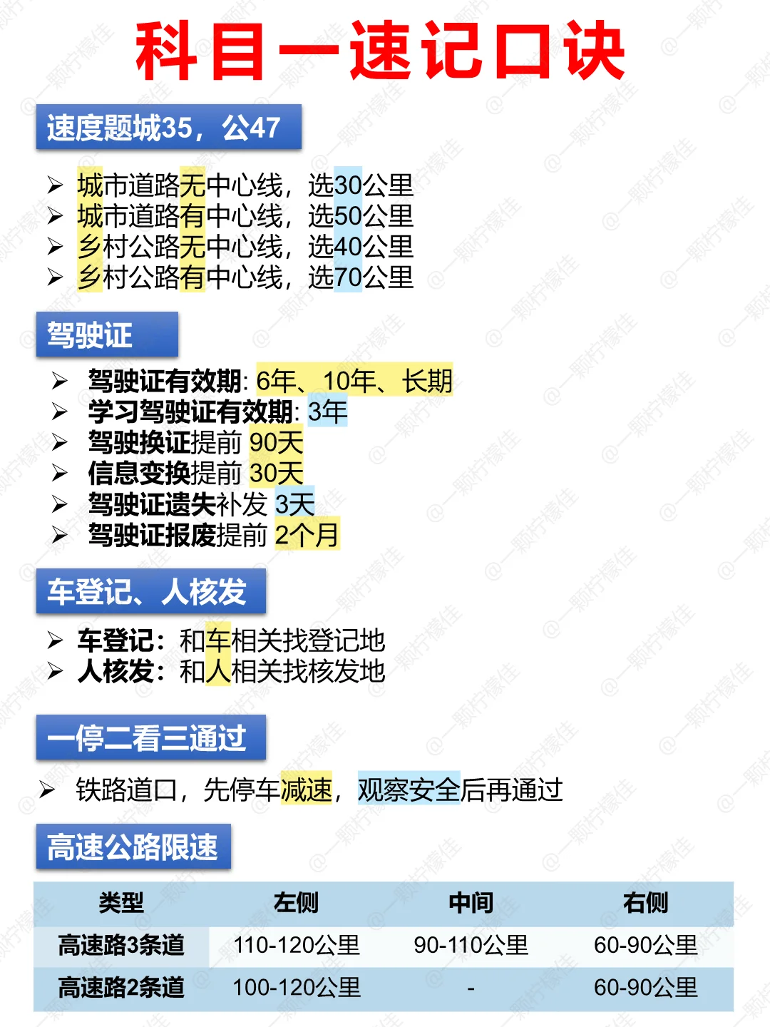宝子们!快来收走2024科目一懒人速记口诀,拿走不谢!😁 - 想轻松搞定科目一90%的考点? 来,看过来,这些都是看完肖~xiaoxiao~的科目一🎬视频后,整理出来的精华哦~~✏️ - 大家可以看完视频再刷题,效果杠杠的! 至于后面那些交通图标,可以直接存手机里,闲的时候翻一翻,加深记忆。 - 记得一定要把错题都过一遍哈,这样基本上就十拿九稳了。 - 祝宝子们科目一都能一把过,不挂科,加油鸭!🤛🏻🤛🏻🤛🏻🤛🏻