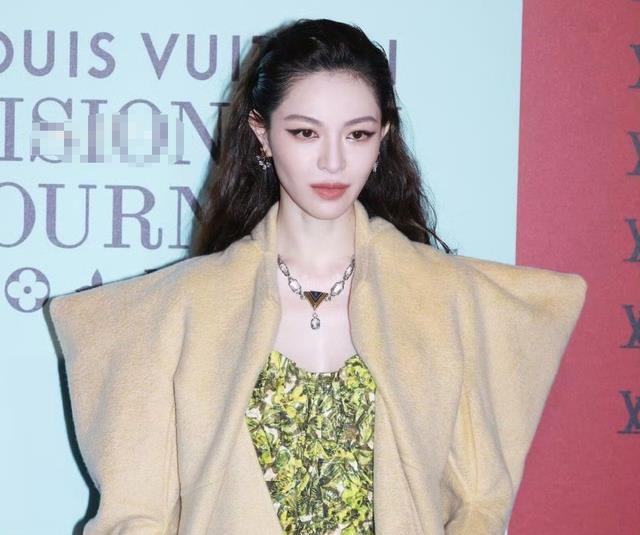 钟楚曦碎花绿裙外罩呢子大衣,肩上顶着两个硕大的“牛角”,让人过目不忘。