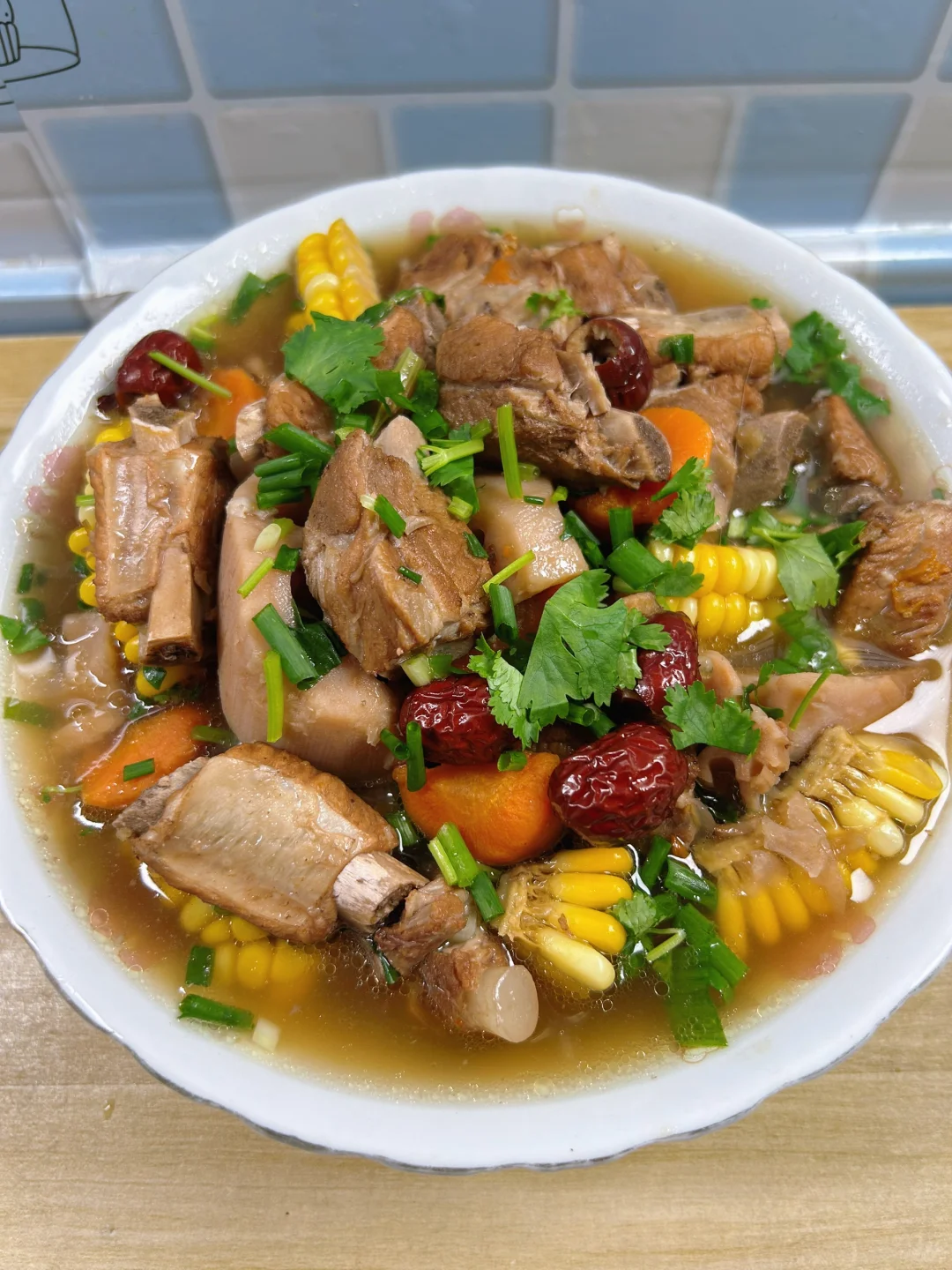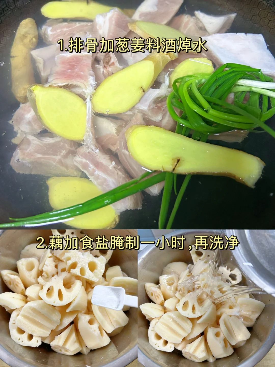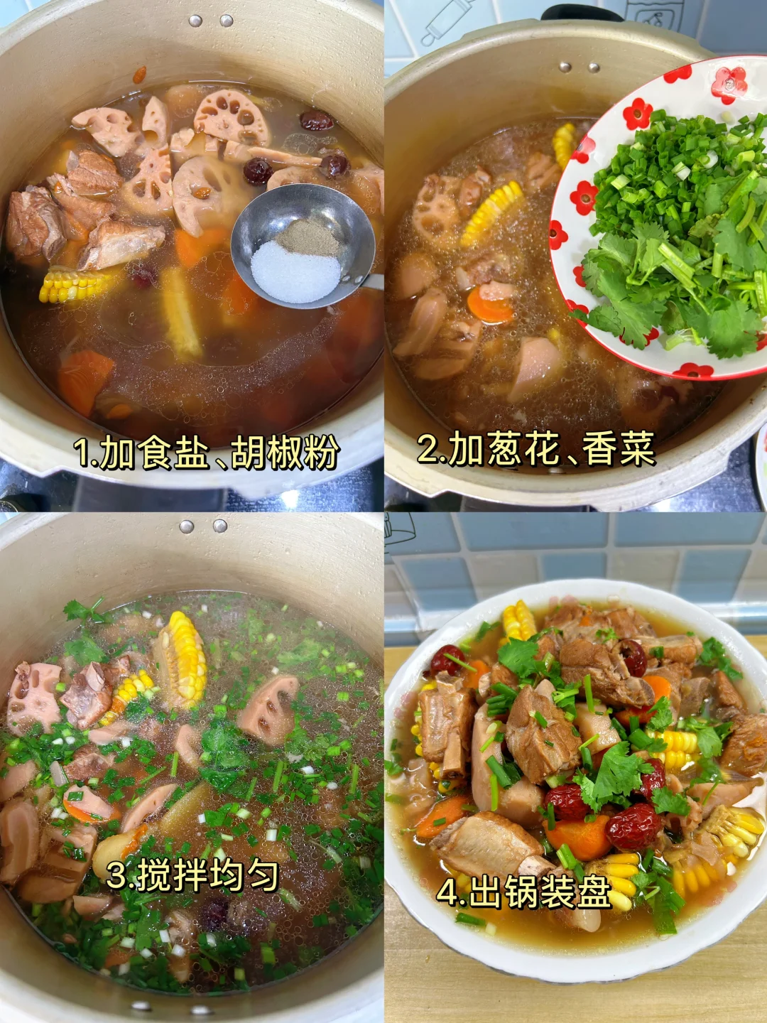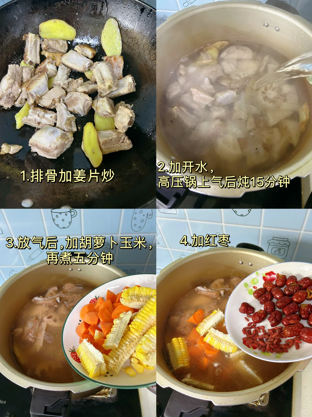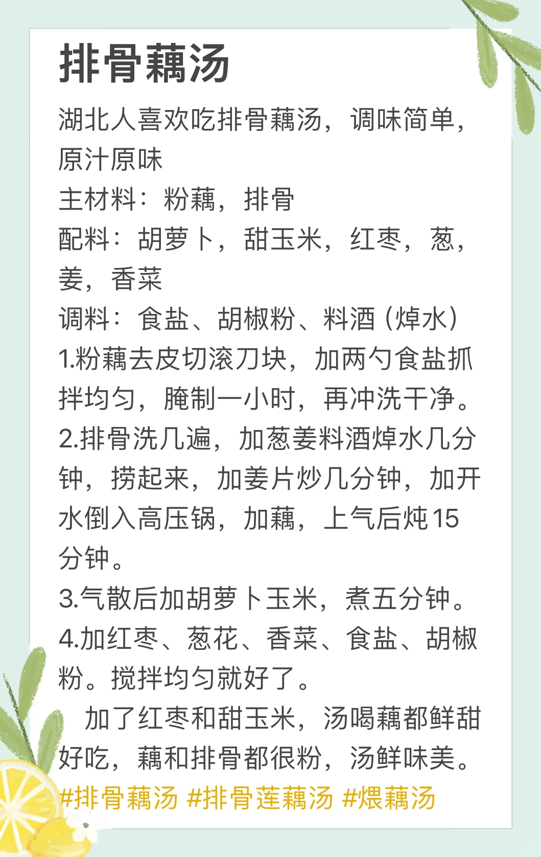 主材料:粉藕,排骨 配料:胡萝卜,甜玉米,红枣,葱,姜,香菜 调料:食盐、胡椒粉、料酒(焯水) 1.粉藕去皮切滚刀块,加两勺食盐抓拌均匀,腌制一小时,再冲洗干净。 2.排骨洗几遍,加葱姜料酒焯水几分钟,捞起来,加姜片炒几分钟,加开水倒入高压锅,加藕,上气后炖15分钟。 3.气散后加胡萝卜玉米,煮五分钟。 4.加红枣、葱花、香菜、食盐、胡椒粉。搅拌均匀就好了。 加了红枣和甜玉米,汤喝藕都鲜甜好吃,藕和排骨都很粉,汤鲜味美。