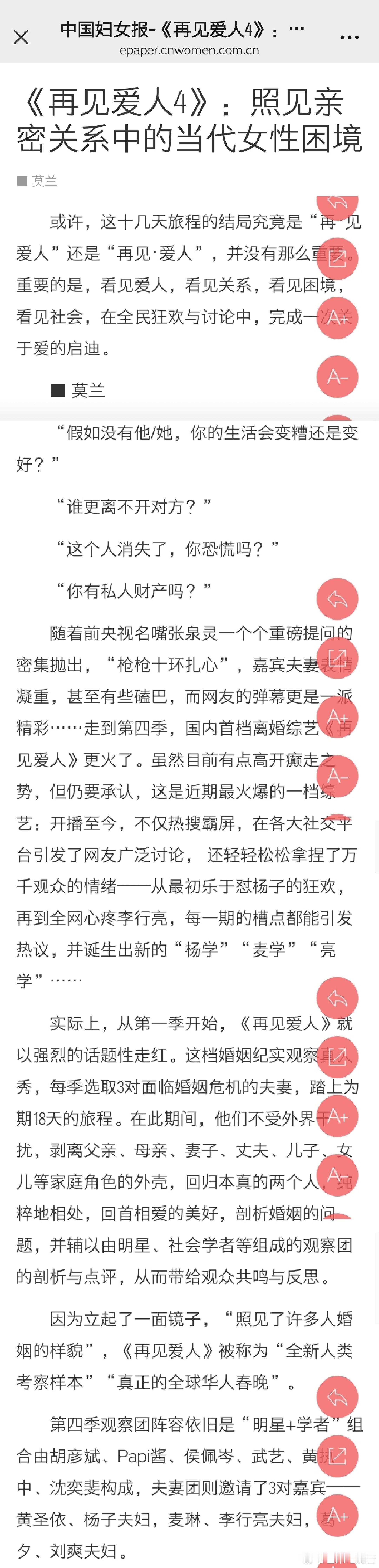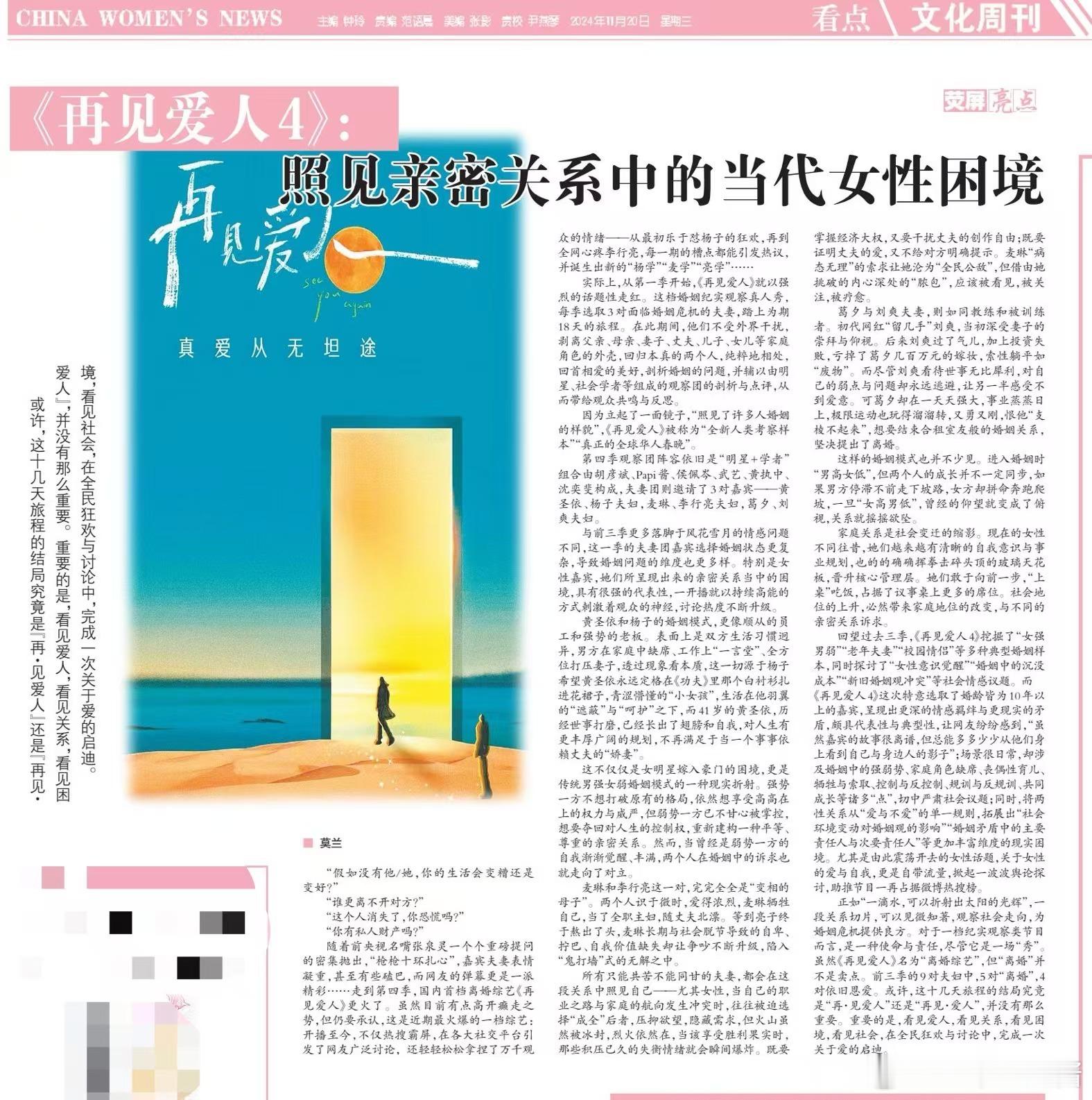 中国妇女报评再见爱人 再见爱人 婚姻是一场漫长的旅程,而这档节目就像是一盏明灯,照亮了我们前行的道路,让我们在迷茫中找到了方向。