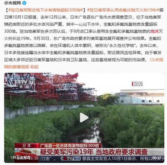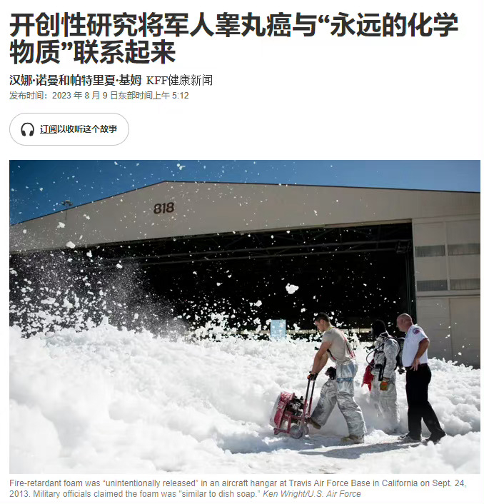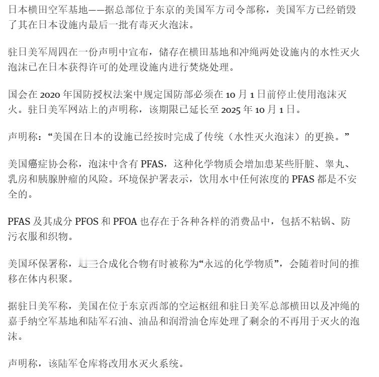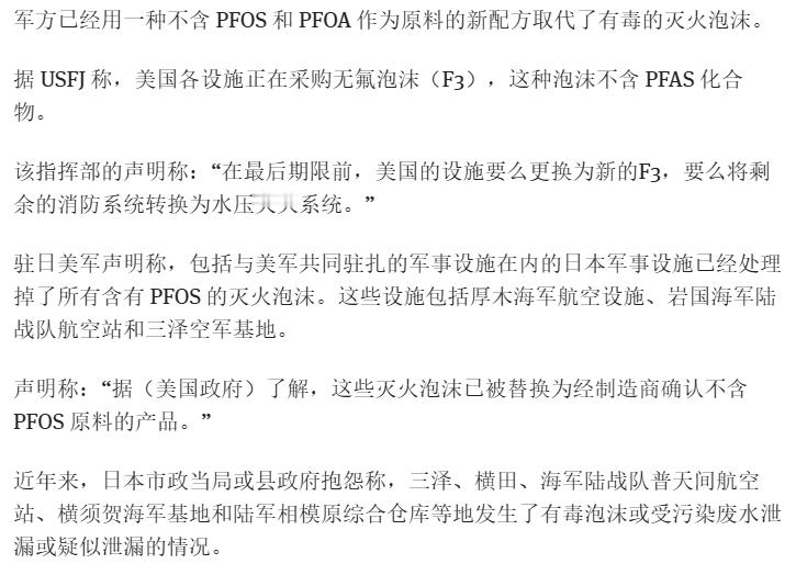 美军傻事 驻日美军在日本基地焚烧最后一批有毒灭火泡沫,美军使用的水成膜(AFFF)消防泡沫含有全氟烷基和多氟烷基物质(PFAS),这两种物质会导致男性军人患睾丸癌的风险增加。美军计划在2024 年10月之前停止使用所有含有 PFAS 的泡沫。PFAS被称为“永远的化学物质”不会在环境中分解,并会在人体内积聚,几乎所有美国人的血液中都含有 PFAS,自 70 年代起就发现会导致癌症,但直到 2000 年代才为公众所知,许多美国消防员和其他退伍军人不得不拼尽全力才能让退伍军人管理局认识到这一点并获得福利。