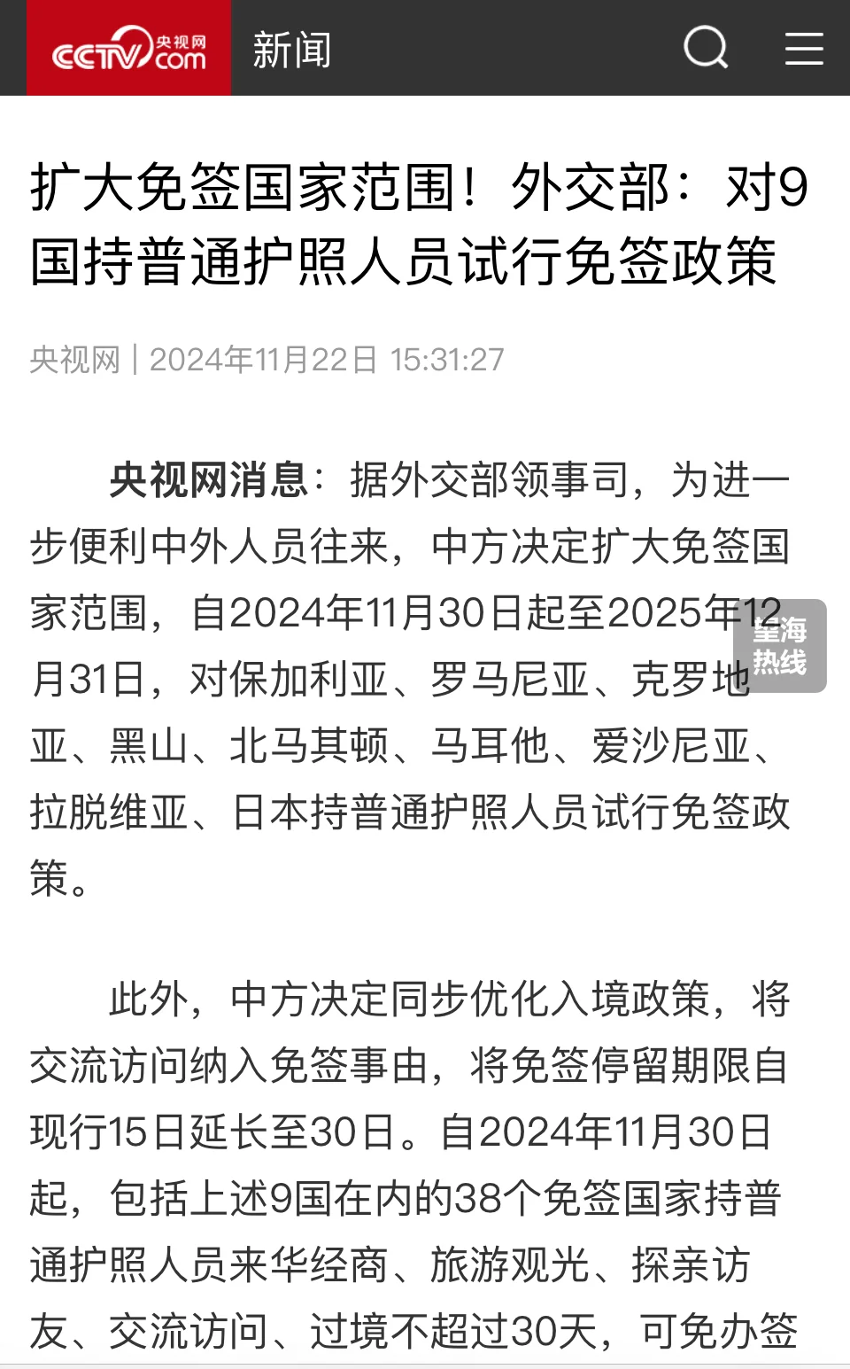 会上发言人表示,自2024年11月30日至2025年12月31日,对保加利亚、罗马尼亚、马耳他、克罗地亚、黑山、北马其顿、爱沙尼亚、拉脱维亚、日本共9个国家持普通护照人员试行免签政策。
