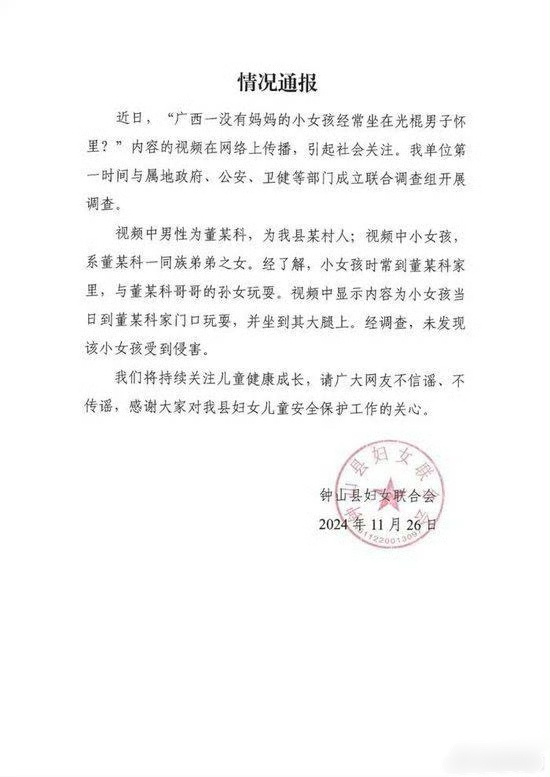 11月26日,钟山县妇女联合会发布情况通报称:视频中男性为董某科,为我县某村人;视频中小女孩系董某科一同族弟弟之女。经了解,小女孩时常到董某科家里,与董某科哥哥的孙女玩耍。视频中显示内容为小女孩当日到董某科家门口玩耍,并坐到其大腿上。经调查,未发现该小女孩受到侵害。