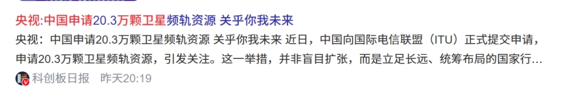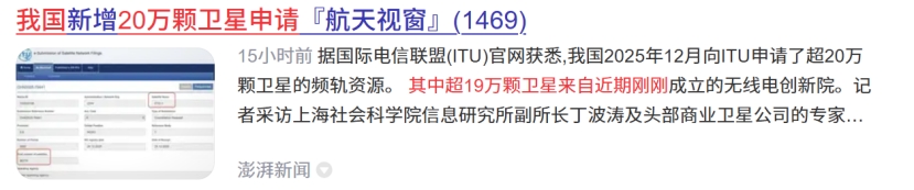 据上海证券报报道,记者查询国际电信联盟(ITU)官网获悉,我国2025年12月向ITU申请了超20万颗卫星的频轨资源。其中,超19万颗卫星来自近期刚刚成立的无线电创新院。
