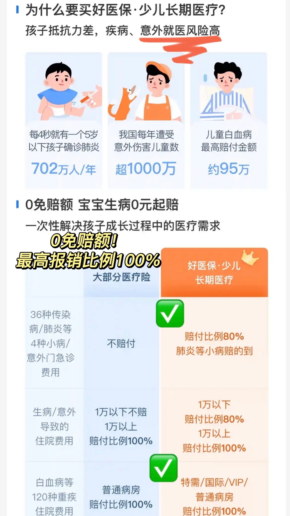 像“好医保·少儿长期医疗”,个人觉得就挺好。不仅保障范围很广,还是0免赔额,也就是说花了1块钱也能赔。不仅白血病等在内的120种儿童高发重疾的住院可以保,报销比例更是100%,就连孩子日常可能用到的肺炎、手足口病、甲乙流感等40种日常小病或者摔伤、宠物咬伤等意外受伤去门急诊费用都能报,可以说,宝宝成长期该要有的保障,它基本都有覆盖到。